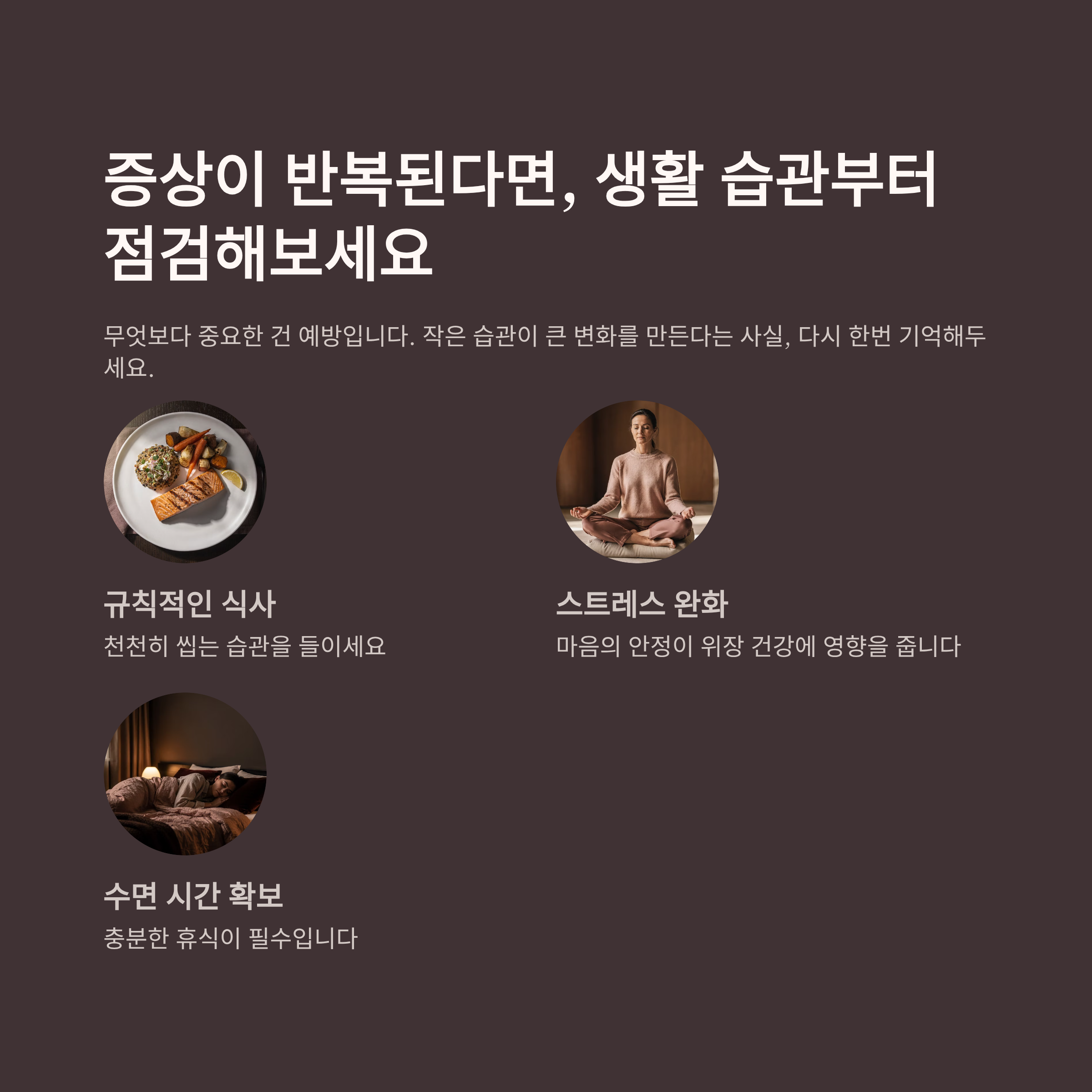 무엇보다 중요한 건 예방입니다. 규칙적인 식사, 천천히 씹는 습관, 스트레스 완화, 수면 시간 확보 등이 모두 급체 증상 예방에 영향을 줍니다. 작은 습관이 큰 변화를 만든다는 사실, 다시 한번 기억해두세요.