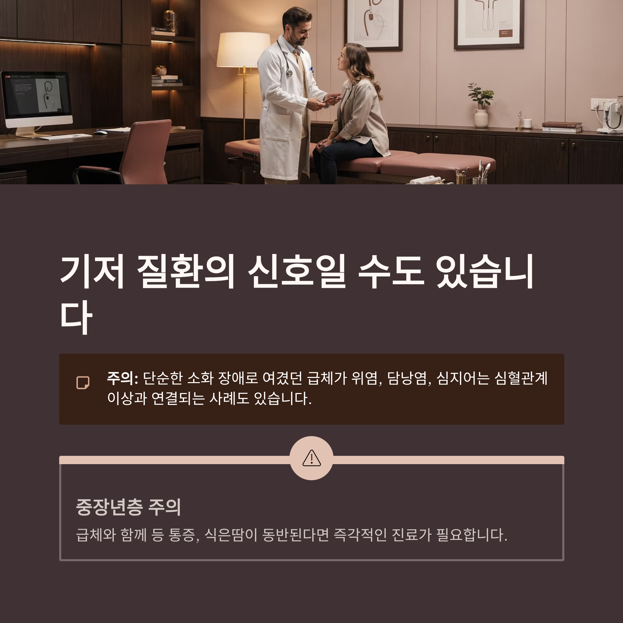 단순한 소화 장애로 여겼던 급체가 위염, 담낭염, 심지어는 심혈관계 이상과 연결되는 사례도 있습니다. 특히 중장년층의 경우 급체와 함께 등 통증, 식은땀이 동반된다면 즉각적인 진료가 필요한 상황일 수 있습니다.