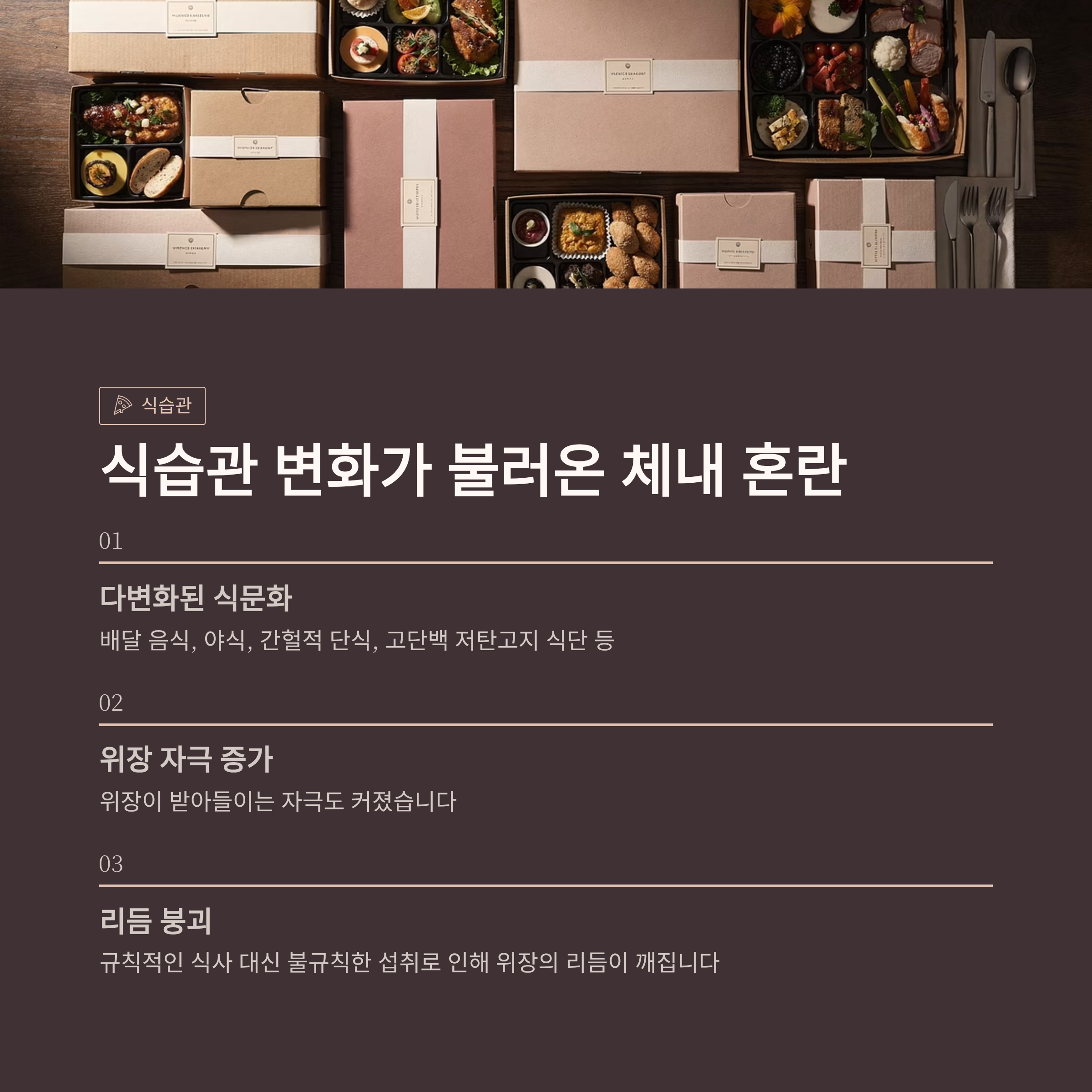 배달 음식, 야식, 간헐적 단식, 고단백 저탄고지 식단 등 식문화가 다변화되면서, 위장이 받아들이는 자극도 커졌습니다. 규칙적인 식사 대신 불규칙한 섭취로 인해 위장의 리듬이 깨지면서, 평소보다 쉽게 급체 증상이 발생할 수 있습니다.
