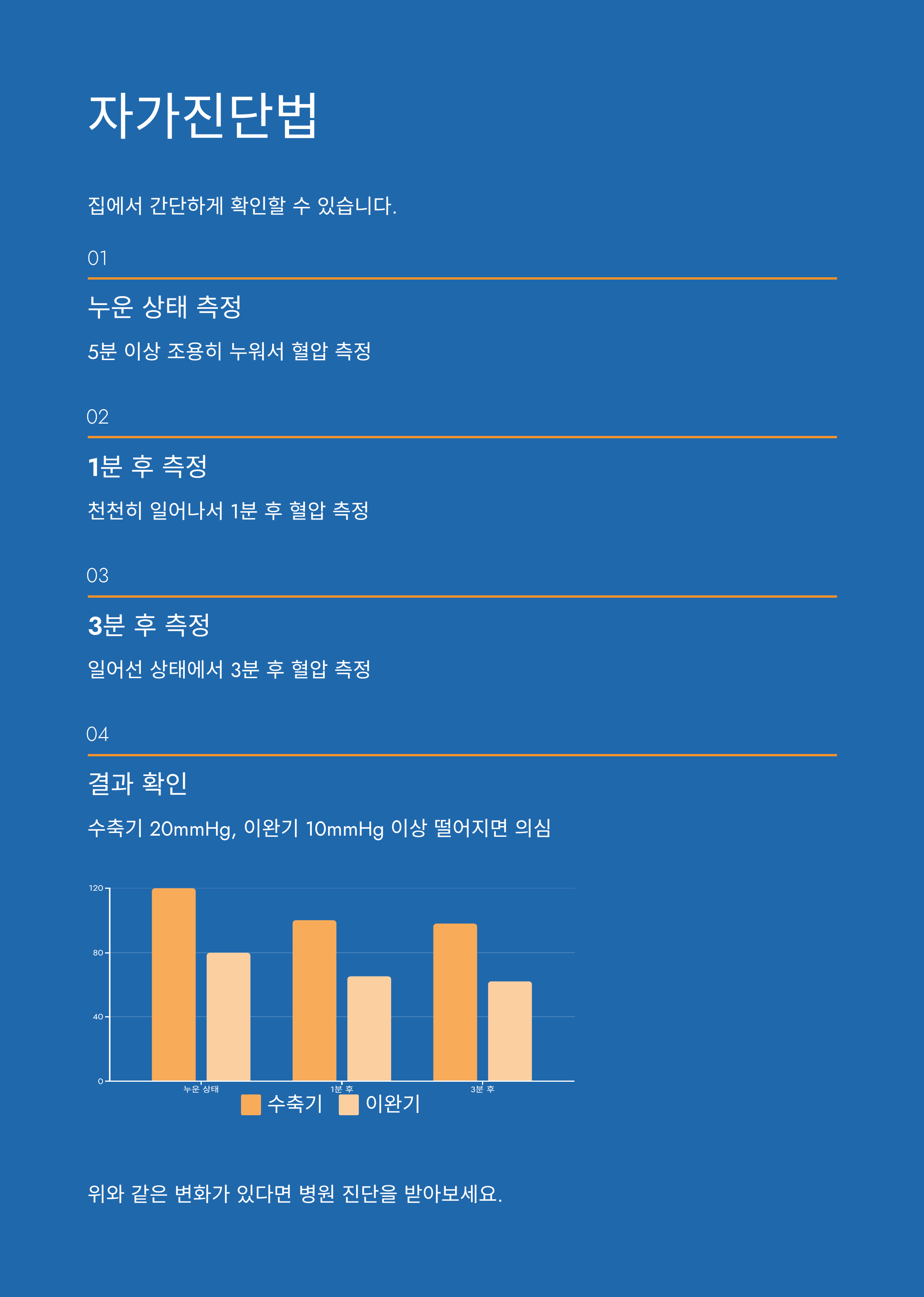 4. 수축기 혈압이 20mmHg 이상, 이완기 혈압이 10mmHg 이상 떨어졌다면 기립성 저혈압 가능성이 있습니다