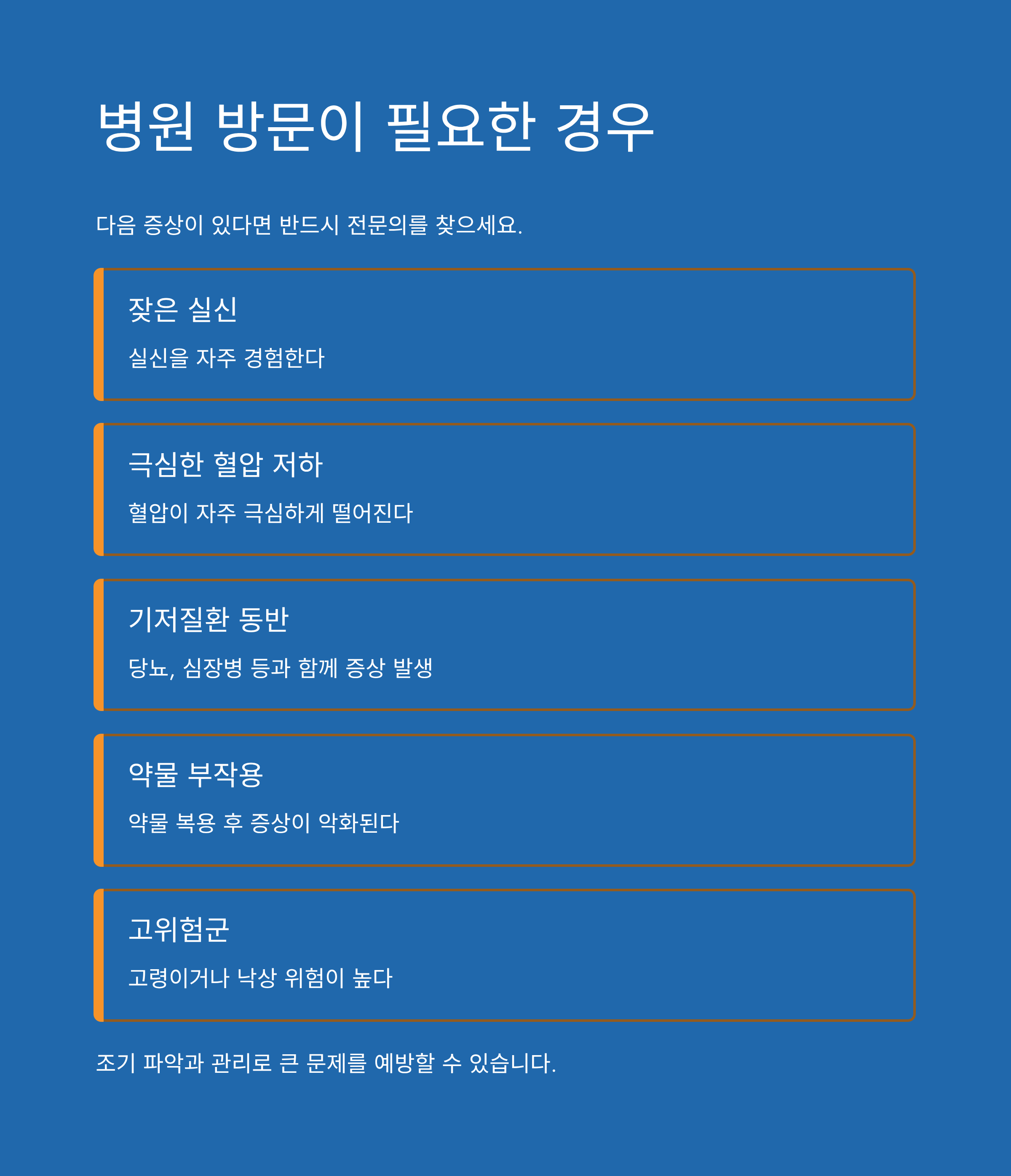 기립성 저혈압은 조기에 파악하고 관리하면 큰 문제가 되지 않지만, 방치하면 위험한 결과로 이어질 수 있으니 주의해야 합니다.