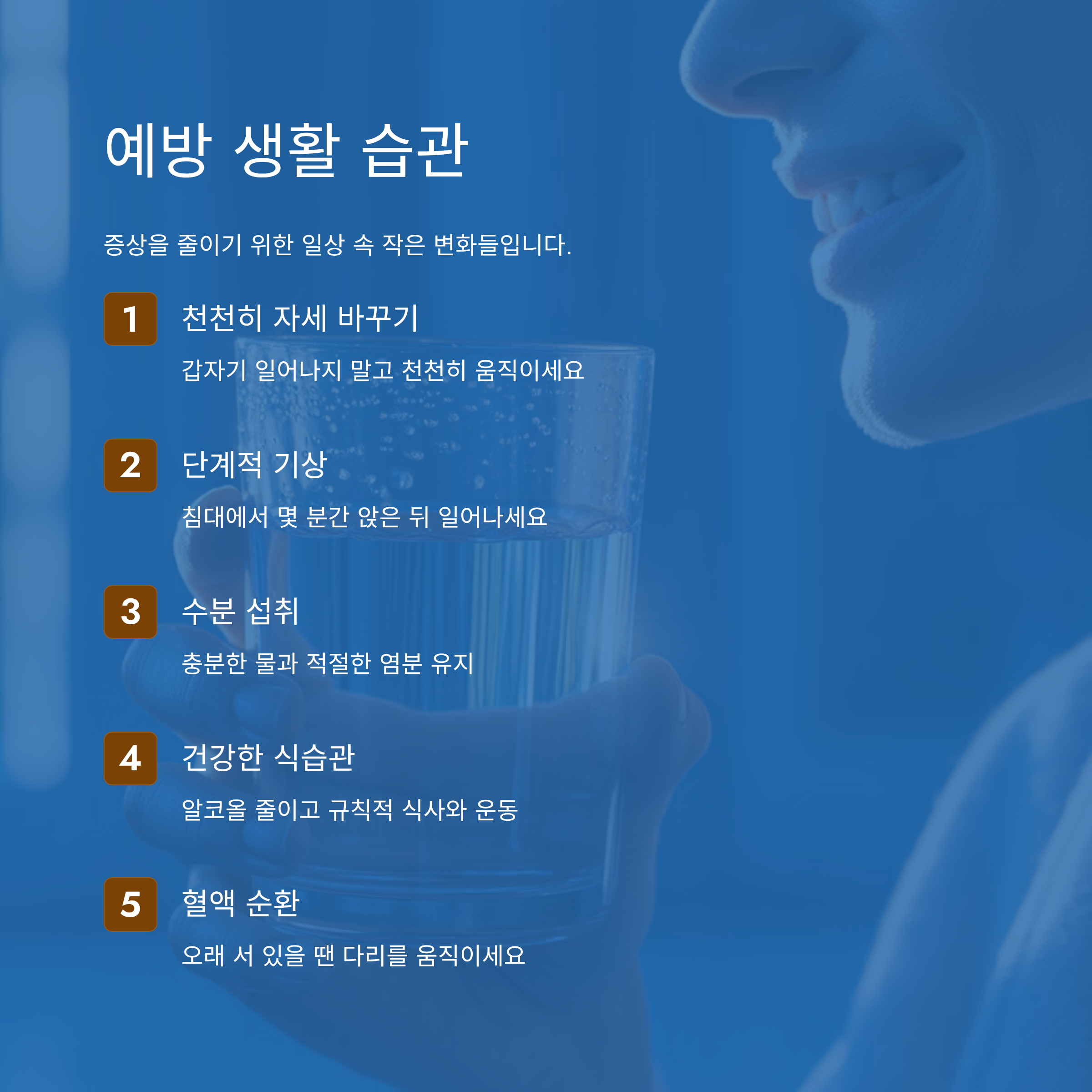 기립성 저혈압을 예방하거나 증상을 줄이기 위해서는 생활 속 작은 변화들이 중요합니다.