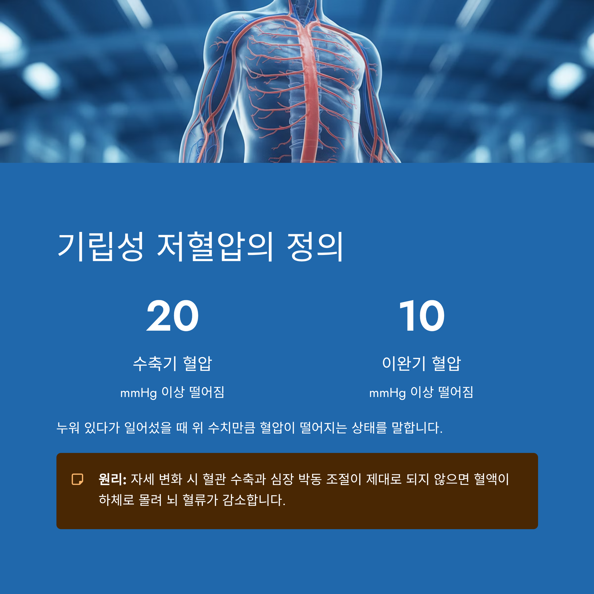 기립성 저혈압은 누워 있다가 일어섰을 때 수축기 혈압이 20mmHg 이상, 이완기 혈압이 10mmHg 이상 떨어지는 상태를 말합니다.