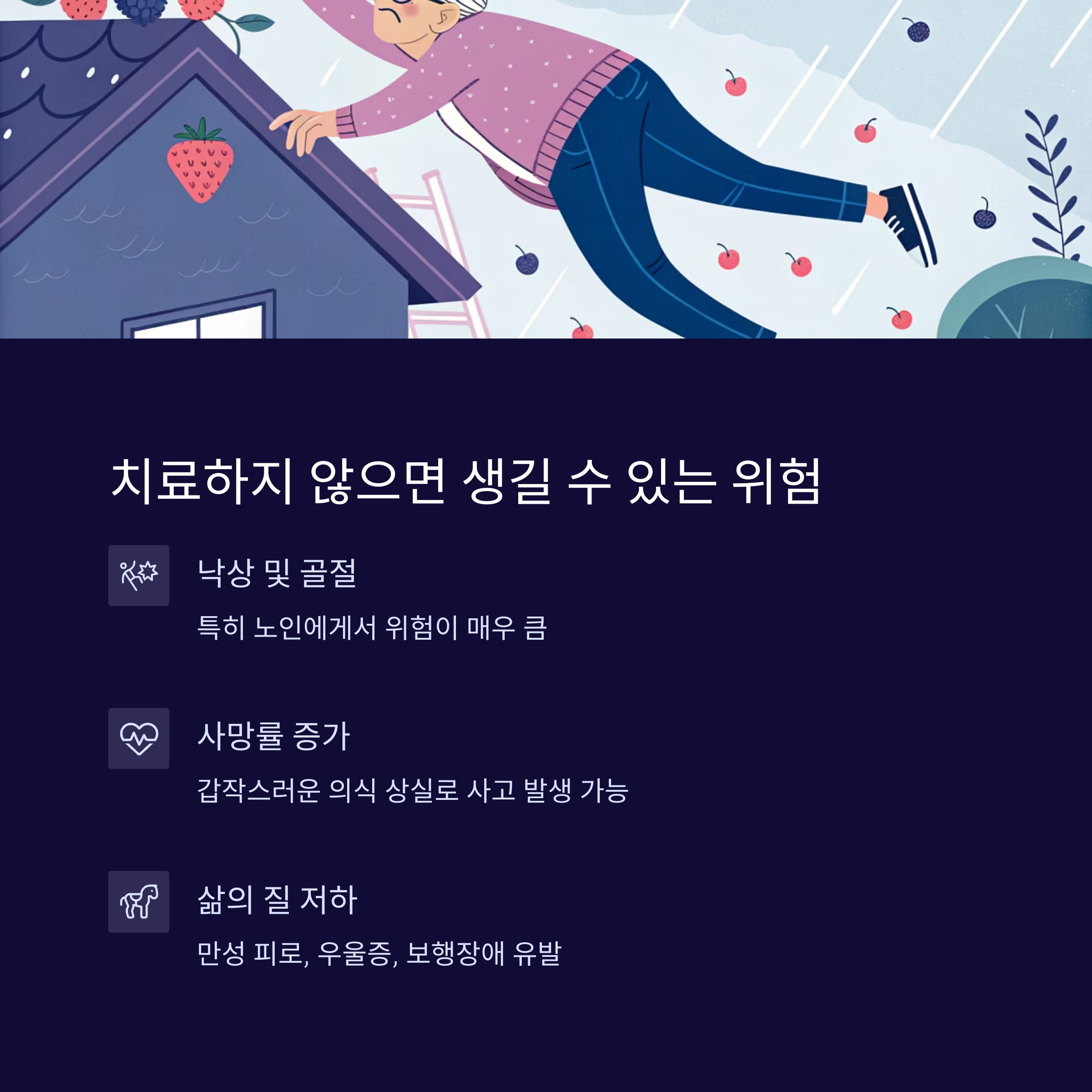- 삶의 질 저하: 만성 피로, 우울증, 보행장애 유발