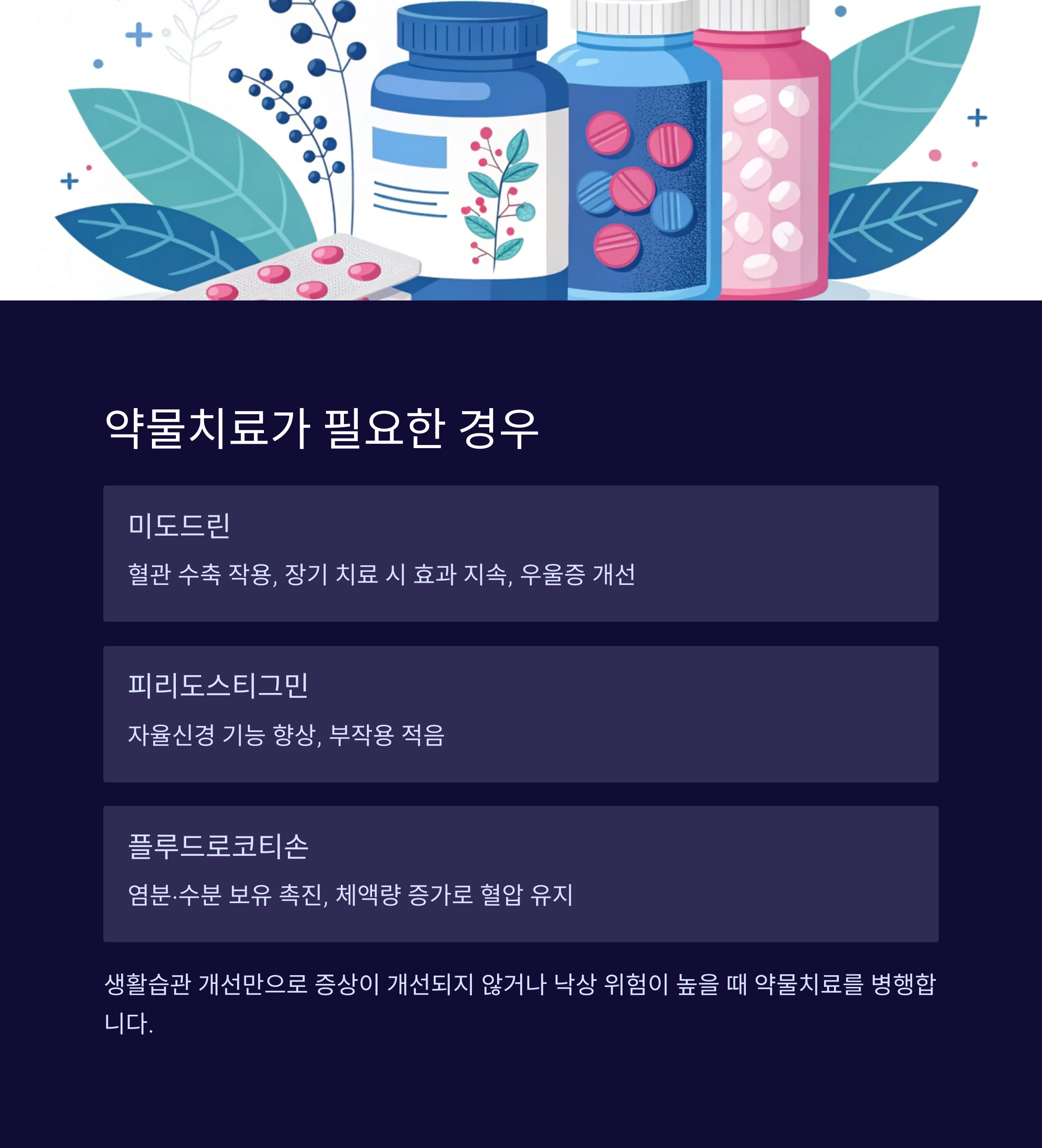 | 플루드로코티손 | 염분·수분 보유 촉진 | 체액량 증가 통해 혈압 유지 |