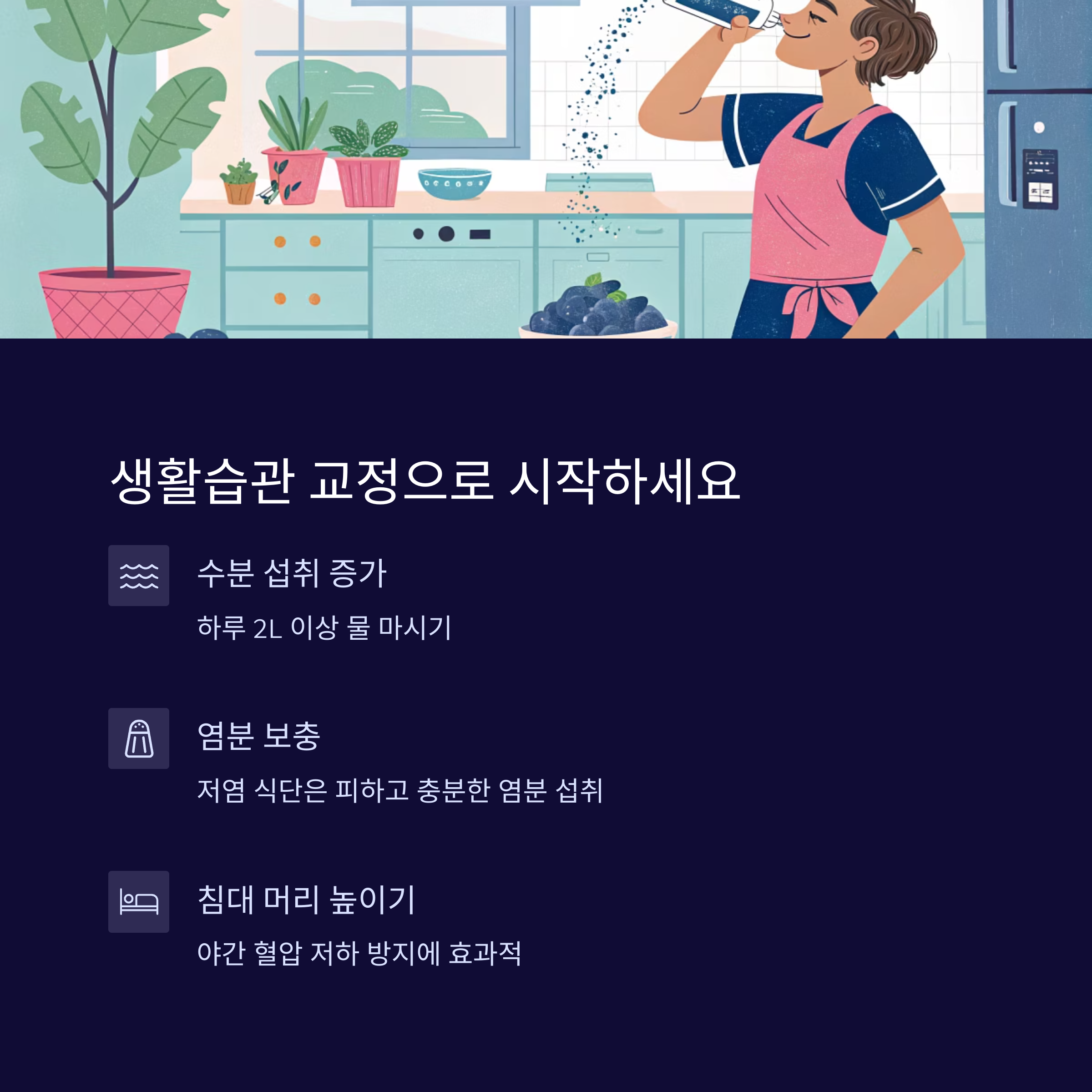 생활습관 개선은 모든 기립성 저혈압 환자가 우선적으로 실천해야 하는 핵심 전략입니다