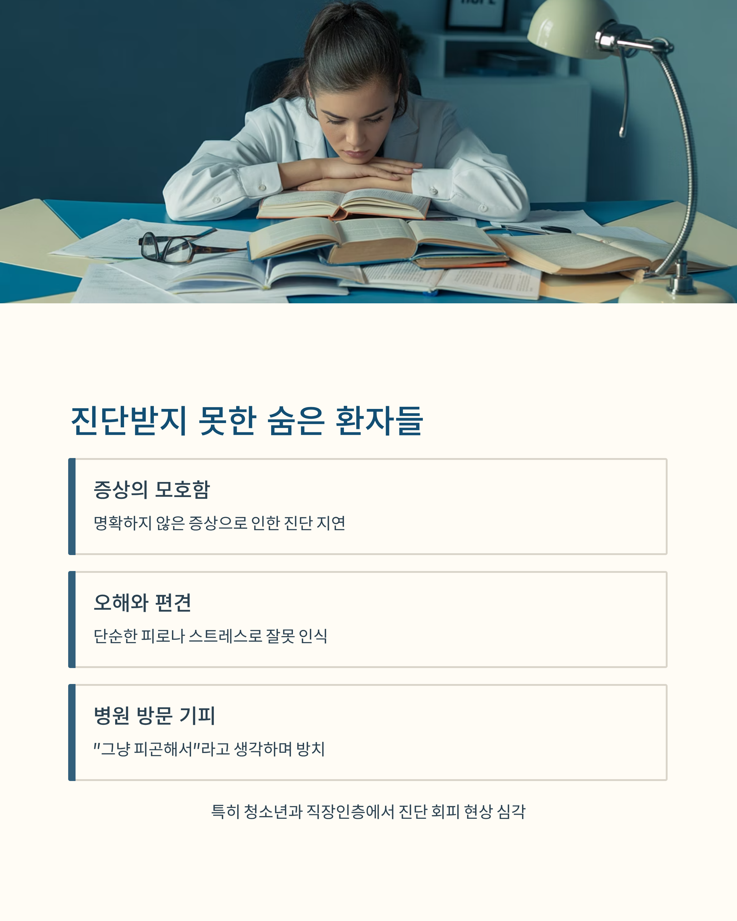 기면증은 특성상 증상이 명확하지 않거나, 단순한 피로나 스트레스로 오해되기 쉽습니다. 이 때문에 많은 환자들이 실제로는 기면증을 앓고 있음에도 진단을 받지 못하고 일상생활을 이어가는 경우가 많습니다. 특히 청소년이나 직장인들은 "그냥 피곤해서"라고 생각하고 병원 방문을 미루는 경우가 많죠.