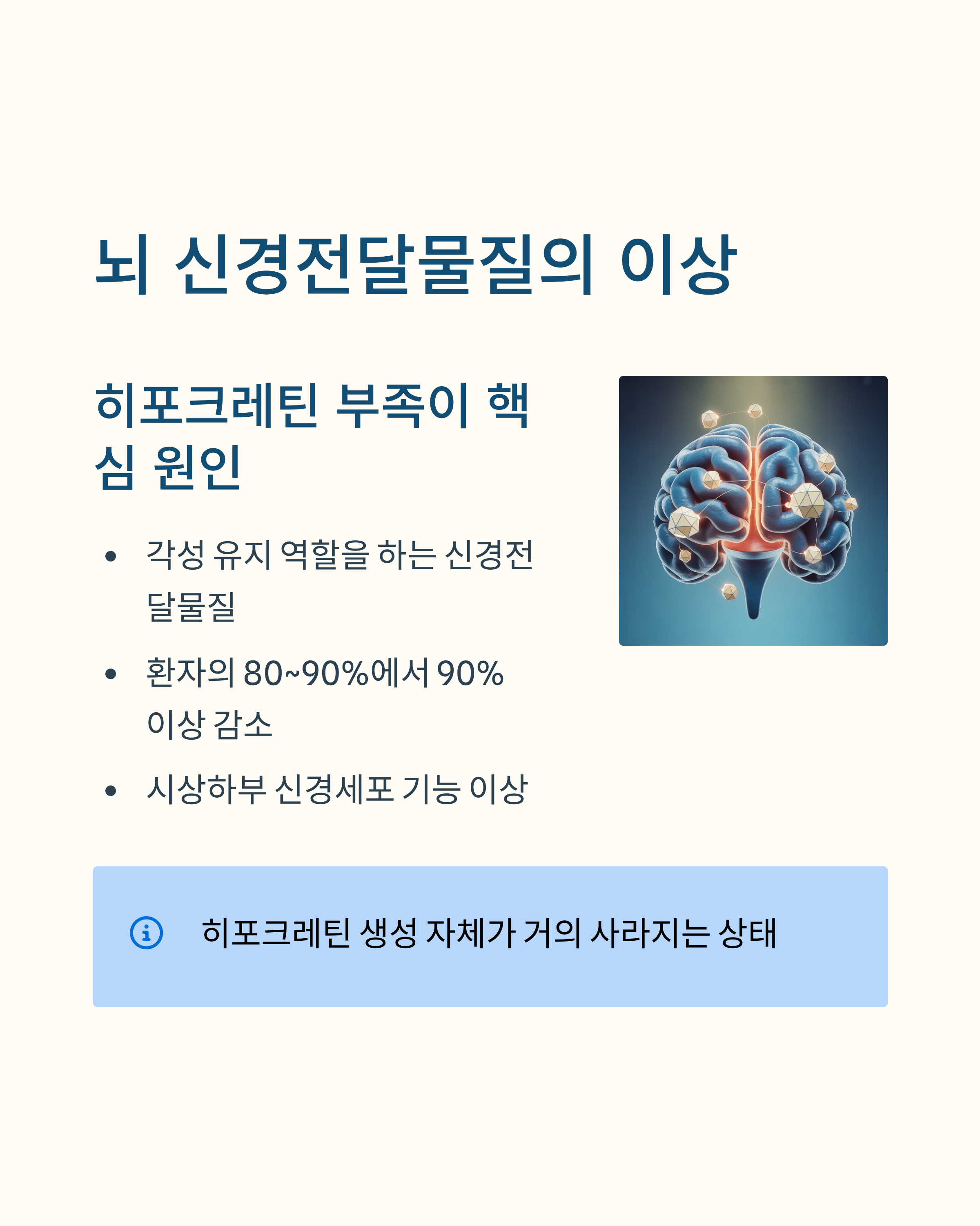 기면증의 가장 핵심적인 원인은 뇌 속 ‘히포크레틴’이라는 신경전달물질의 부족입니다. 이 물질은 우리가 깨어 있을 수 있도록 각성을 유지하는 역할을 하는데요, 기면증 환자의 약 80%~90%는 이 히포크레틴이 정상보다 90% 이상 감소된 상태입니다. 특히 시상하부에 있는 특정 신경세포의 기능 이상으로 인해 이 전달물질의 생성 자체가 거의 사라지게 됩니다.
