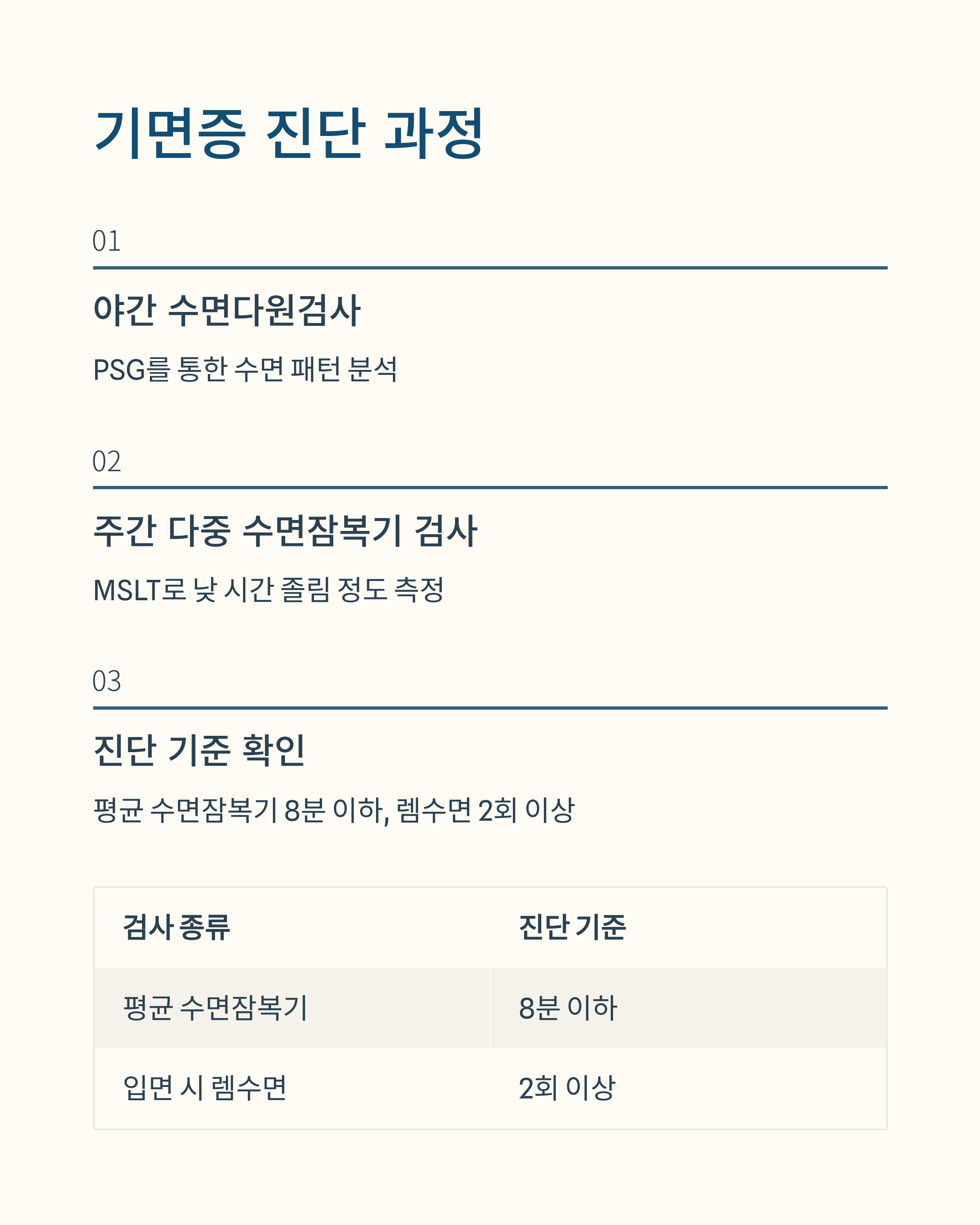 진단을 위해서는 일반적으로 야간 수면다원검사(PSG)와 주간 다중 수면잠복기 검사(MSLT)를 함께 진행합니다. MSLT에서 평균 수면잠복기가 8분 이하이고, 수면 중 2회 이상 렘수면(REM)에 도달하면 기면증으로 진단합니다.