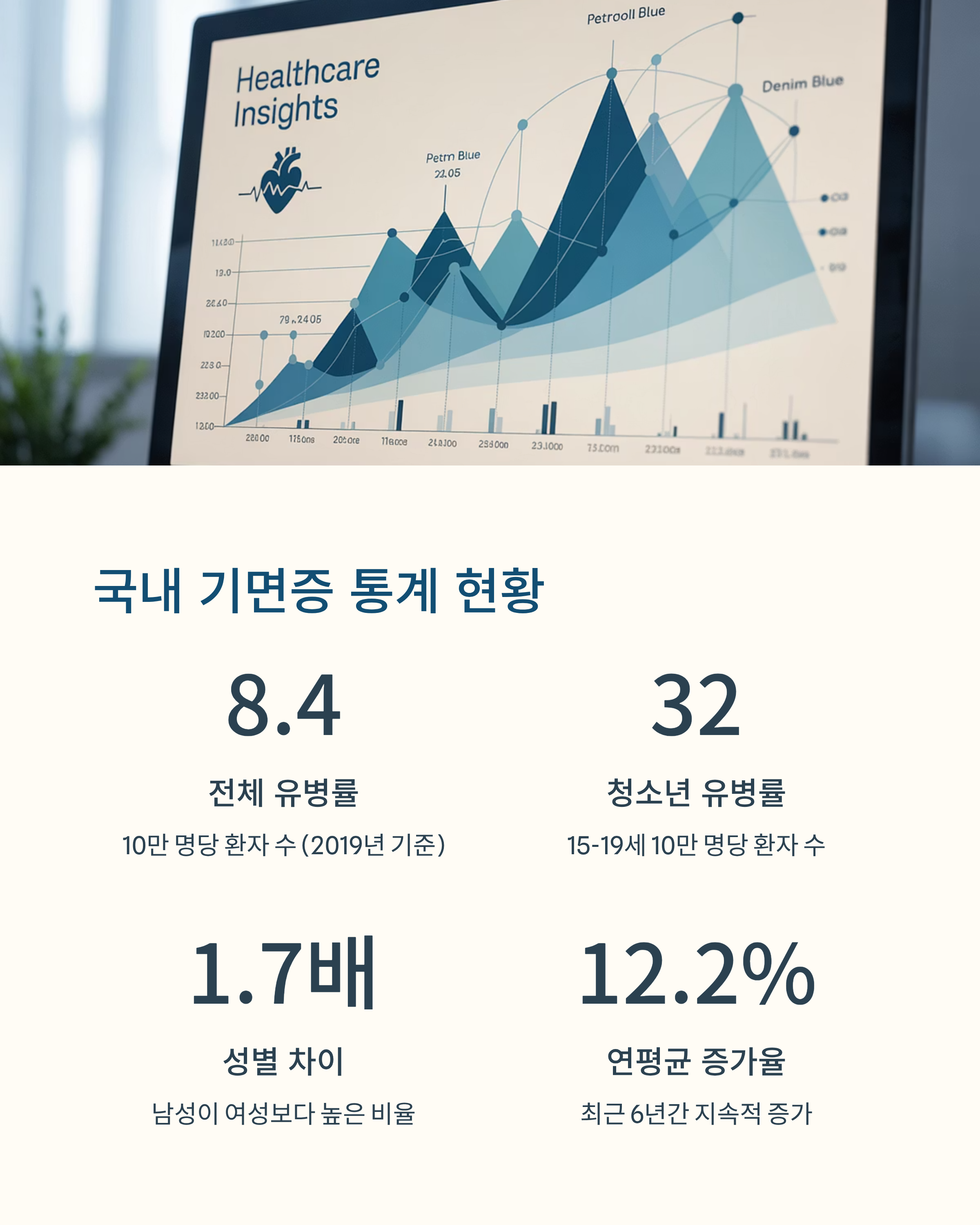 한국신경과학회와 건강보험공단의 2019년 자료에 따르면 국내 전체 인구 대비 기면증 유병률은 10만 명당 8.4명입니다. 그런데 15세~19세 청소년에서는 이 수치가 10만 명당 32명으로 급증합니다. 남성의 유병률은 여성보다 1.7배나 높으며, 최근 6년간 연평균 증가율도 12.2%에 달합니다.