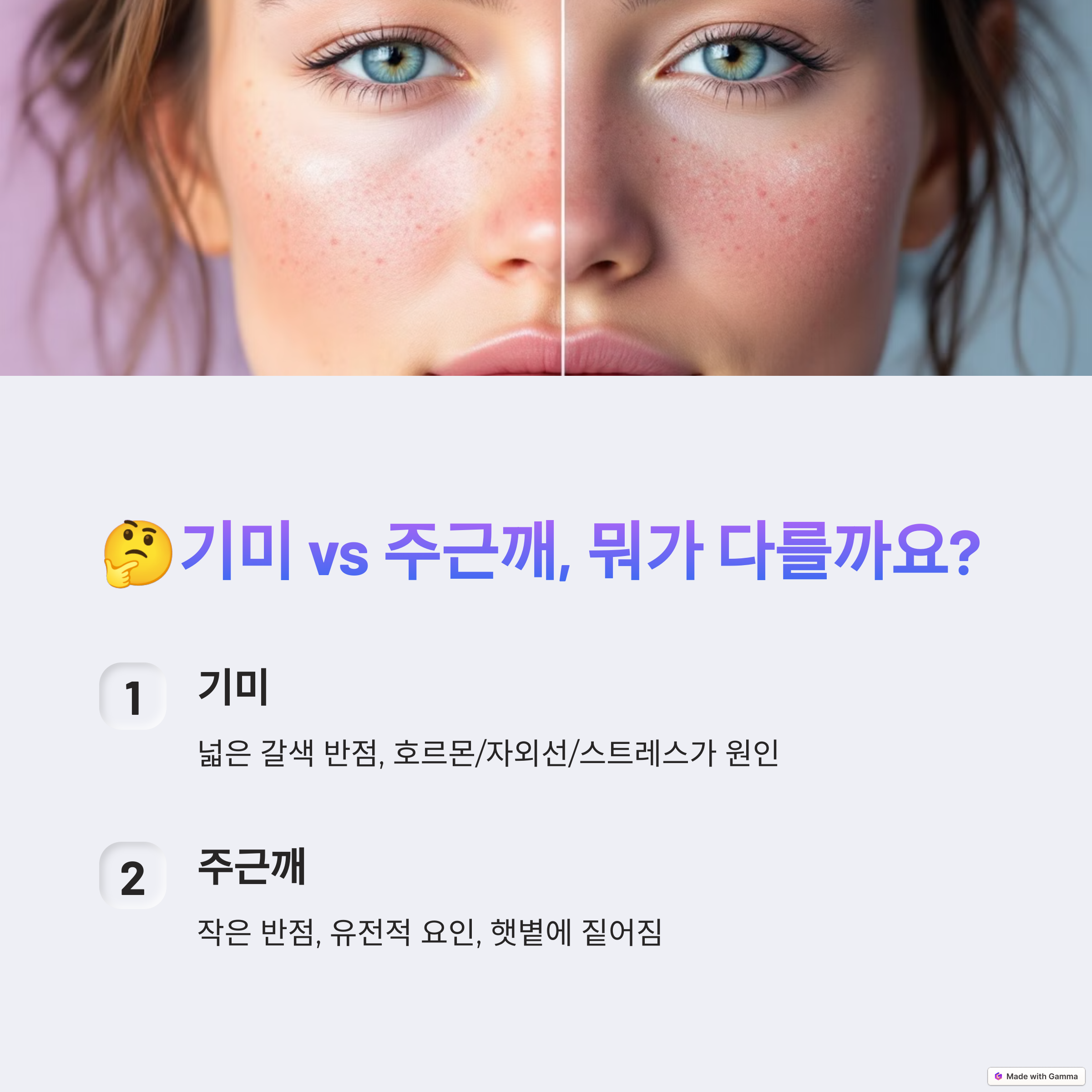 | 기미 vs 주근깨 | 기미는 호르몬 변화, 자외선, 스트레스로 인해 생기며 얼굴에 넓게 퍼지는 특징이 있습니다. 주근깨는 유전적 요인이 크고, 햇볕을 받을수록 색이 짙어지는 경향이 있습니다. |