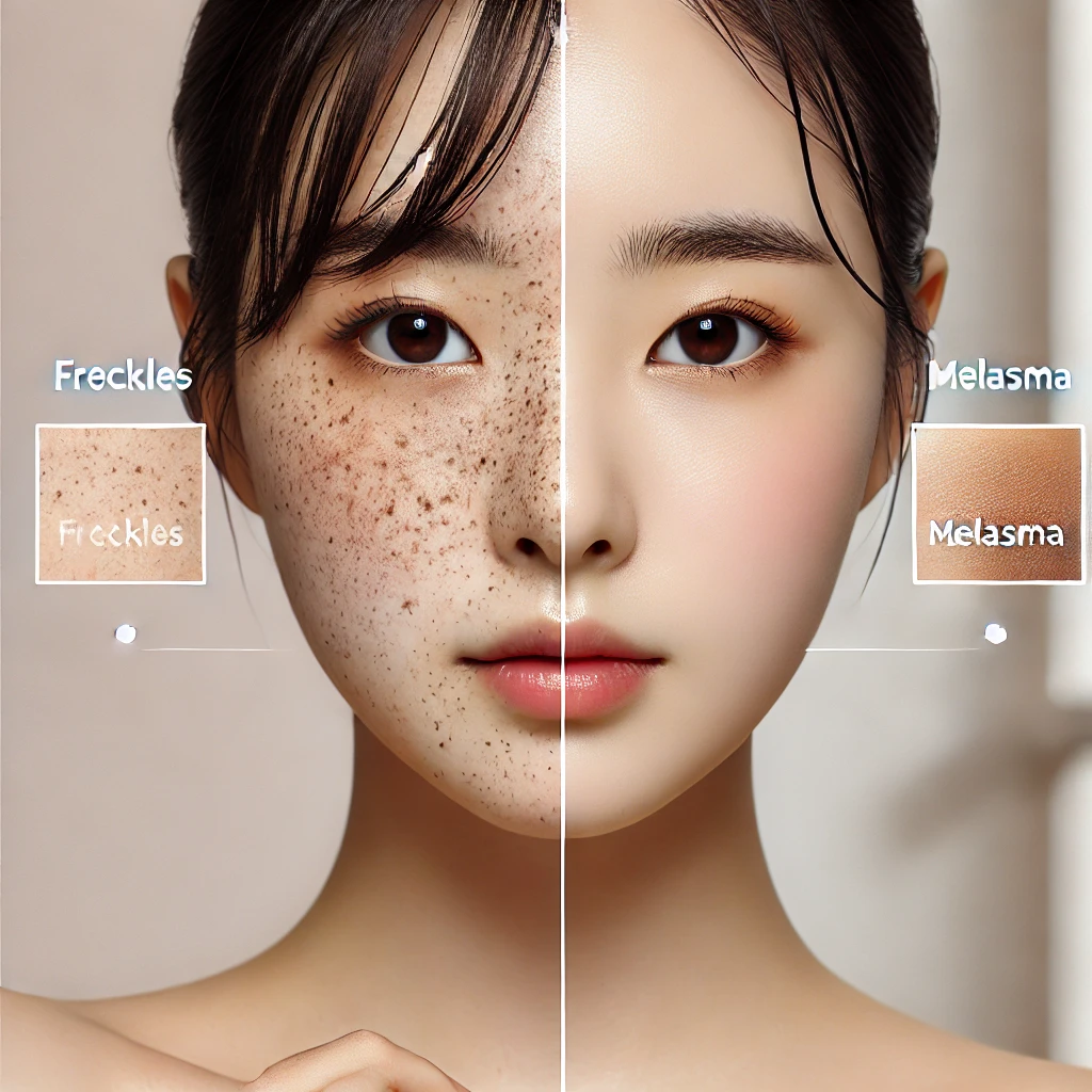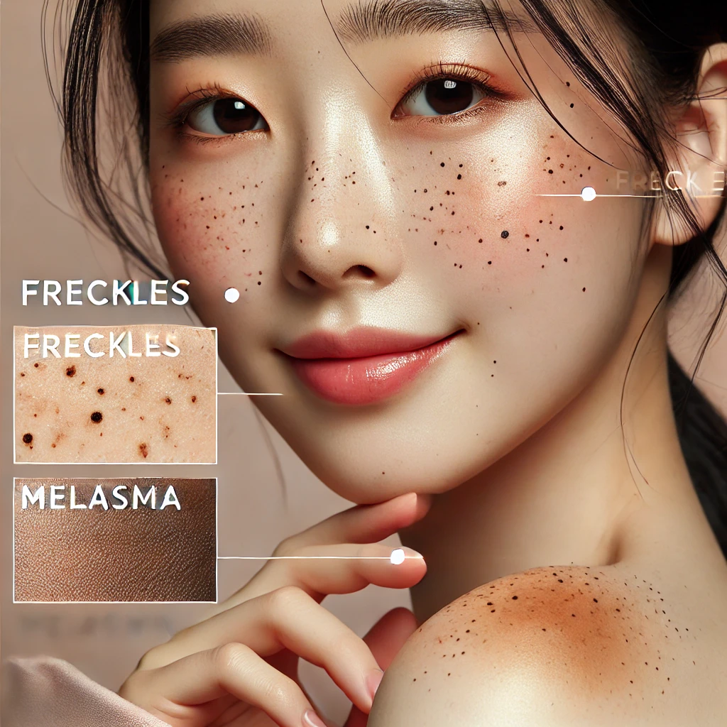 - 원인: 기미는 호르몬과 관련이 깊고, 주근깨는 유전과 자외선이 주요 원인입니다.
