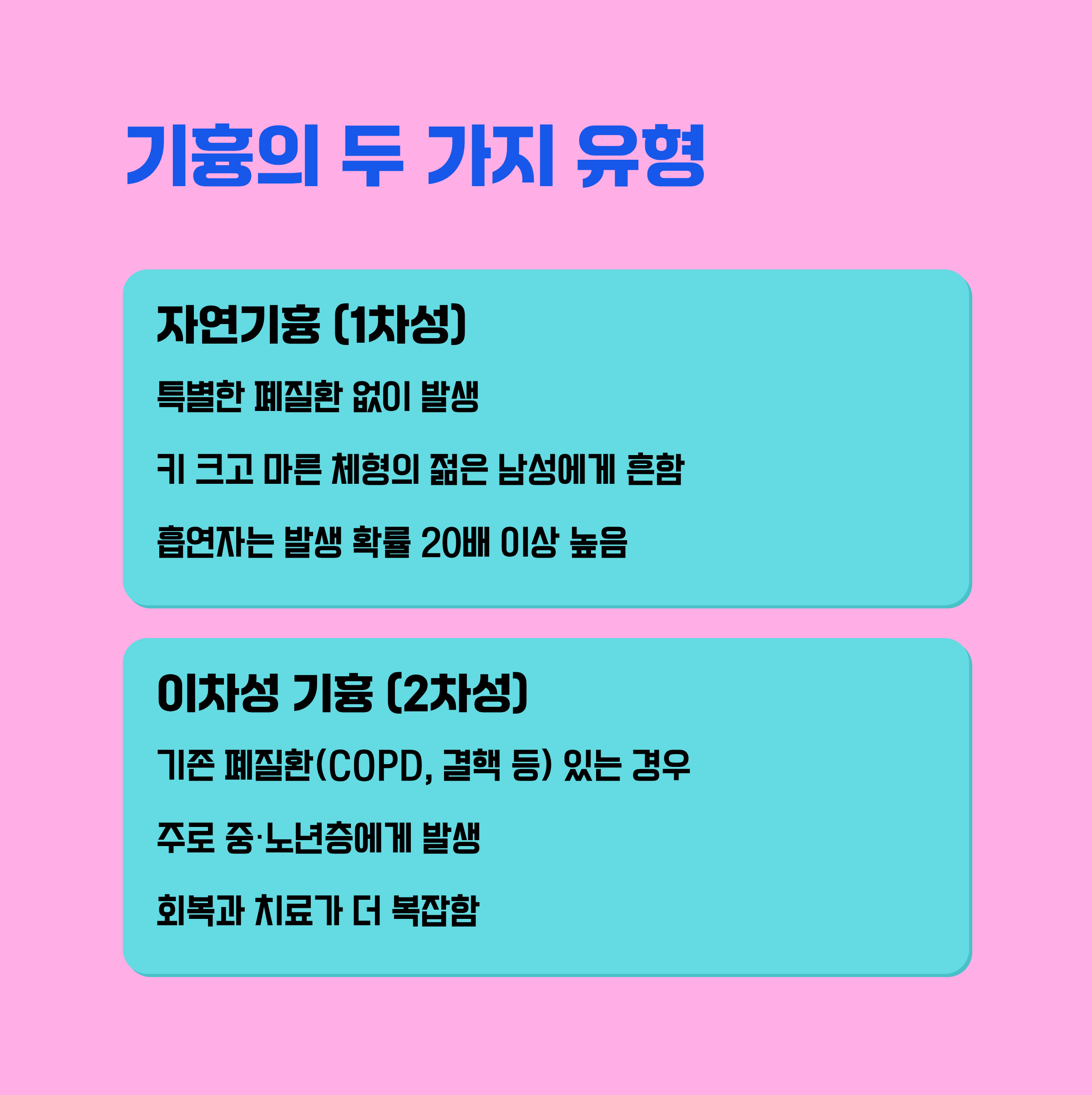 | 이차성 기흉 (2차성) | 기존 폐질환(예: COPD, 결핵 등)을 가진 중·노년층에게서 발생 |
