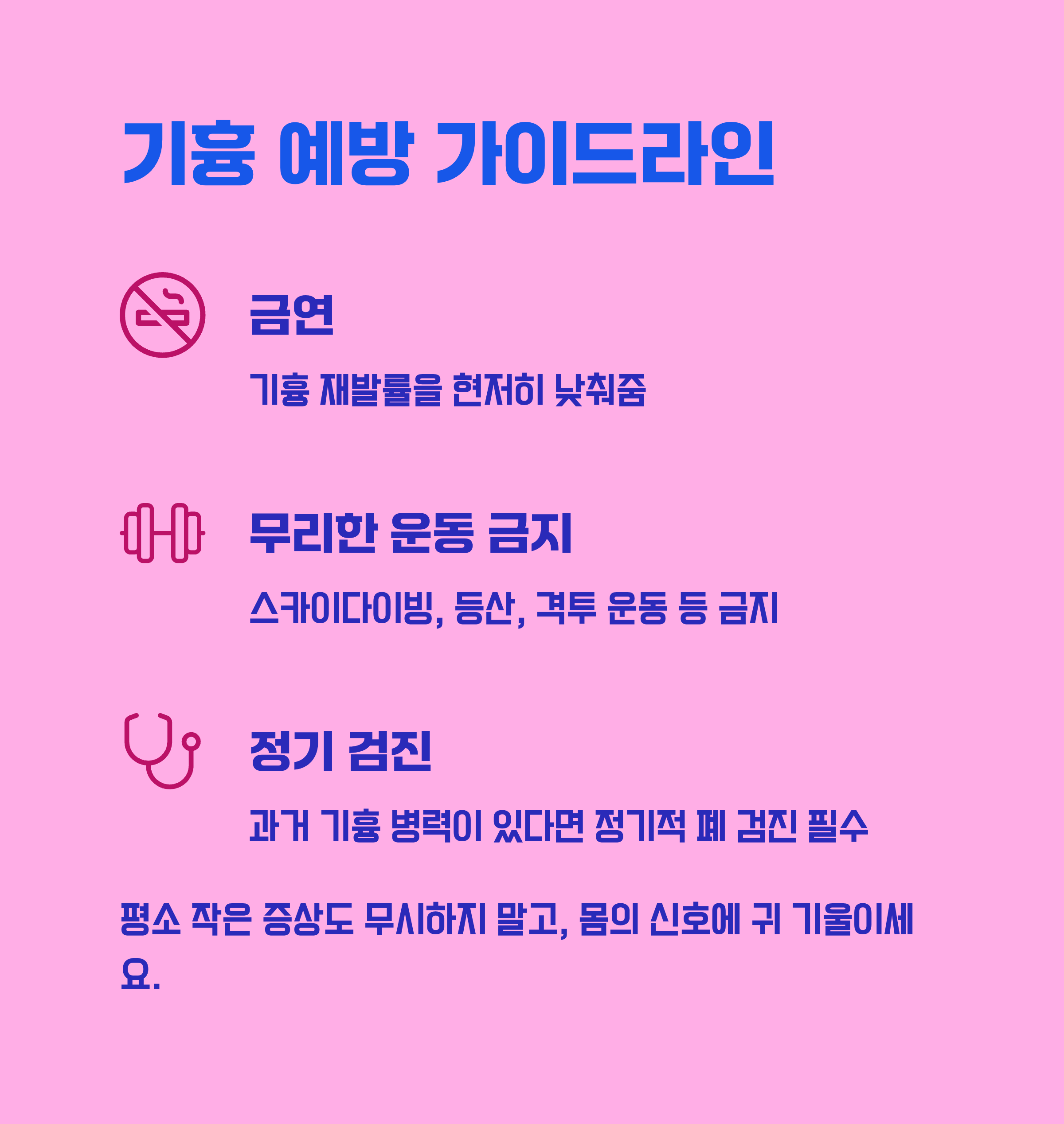 | 정기 검진 | 과거 기흉 병력이 있다면 정기적 폐 검진 필수 |