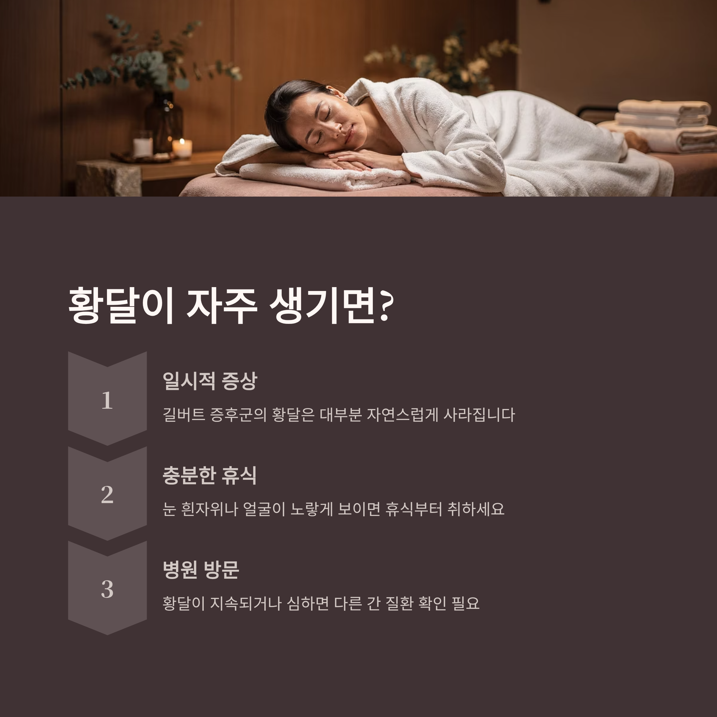 하지만 드물게 특정 상황에서 증상이 나타날 수 있어요. 예를 들어, 과로하거나 스트레스를 심하게 받을 때 황달 증상이 살짝 나타날 수 있죠.