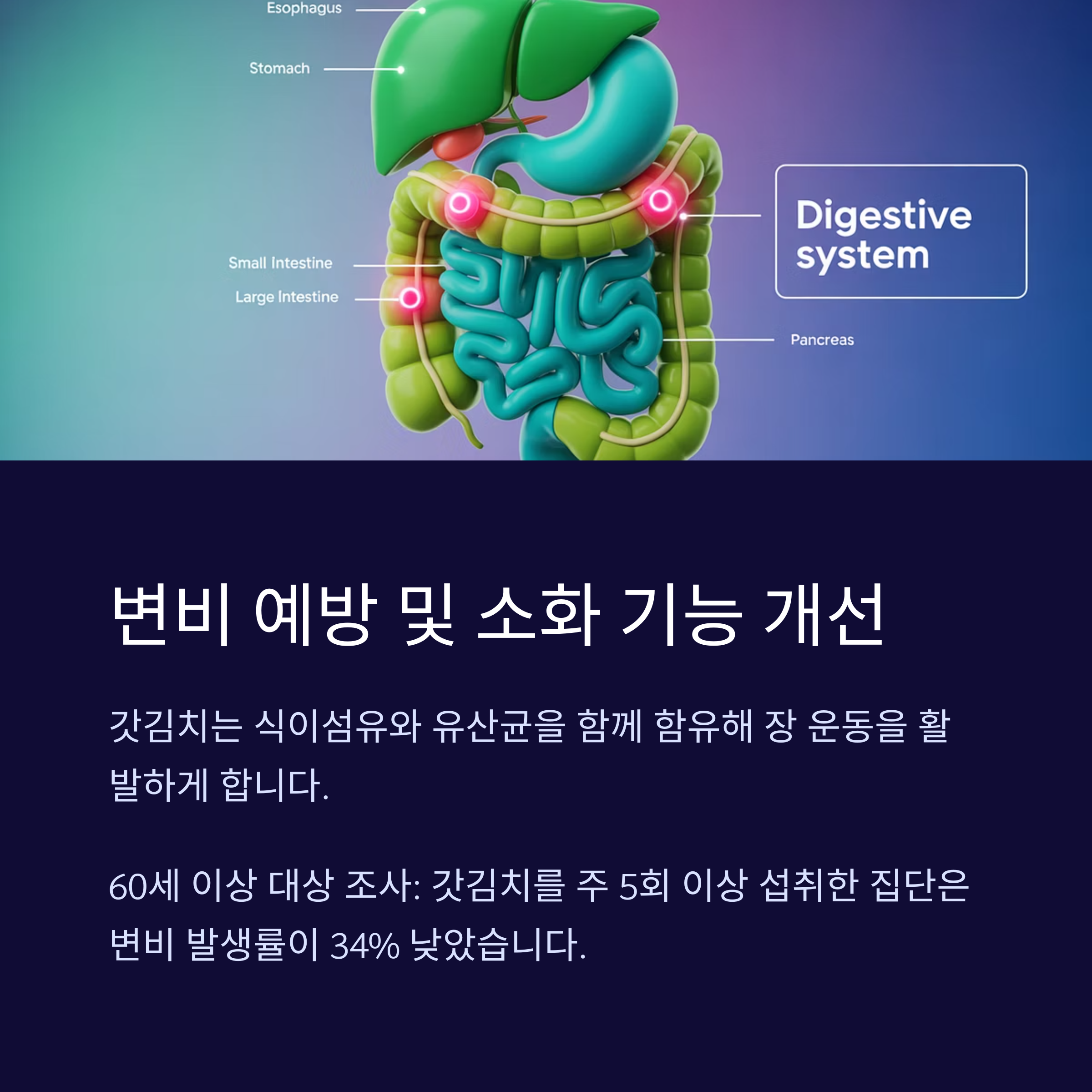 2024년 60세 이상을 대상으로 한 조사에 따르면 갓김치를 주 5회 이상 섭취한 집단은 변비 발생률이 일반군보다 34% 낮았습니다.