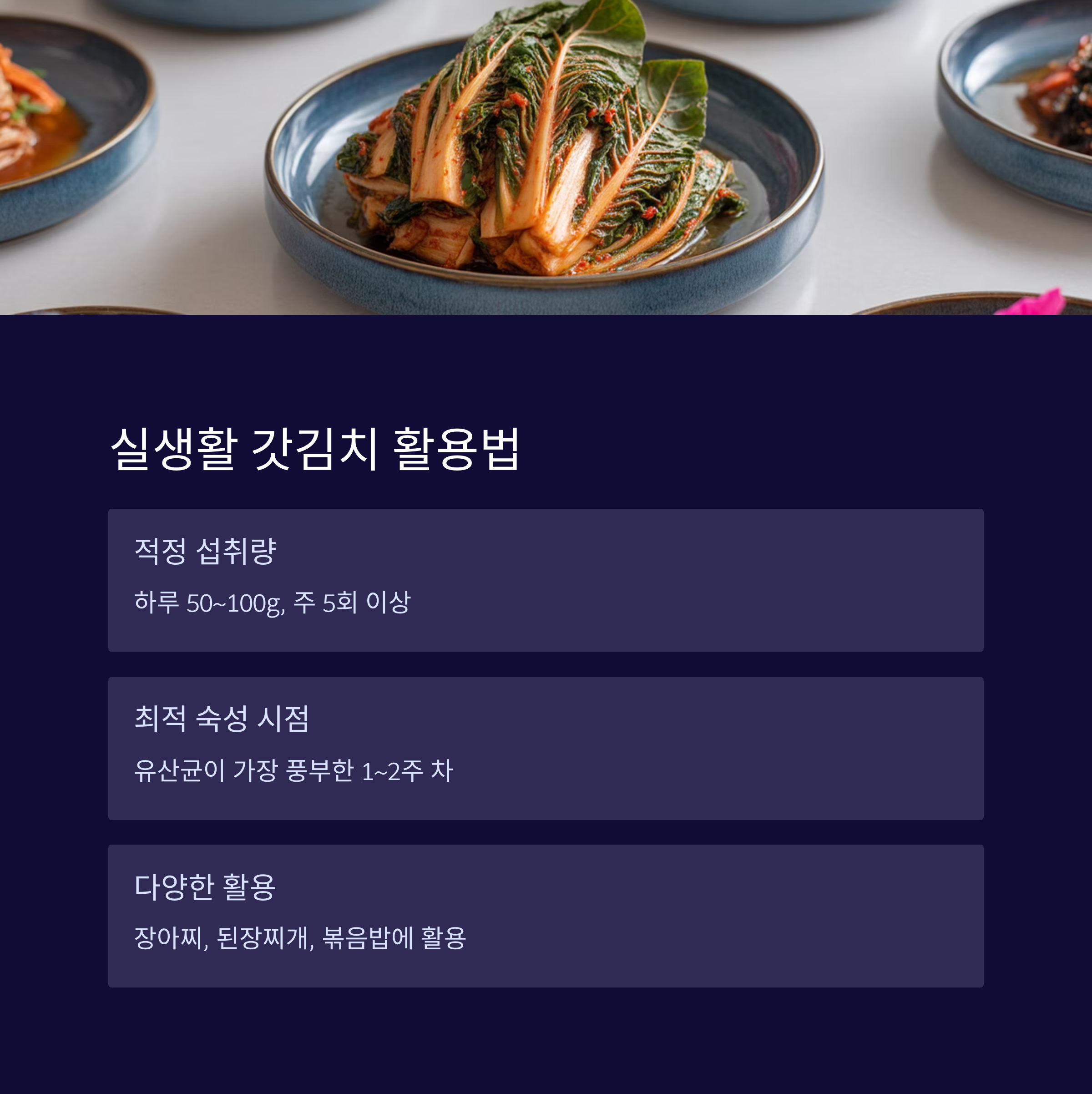 하루 50g~100g, 주 5회 이상 섭취가 적절하며, 가장 유산균이 풍부한 시점은 숙성 1주~2주 차입니다.