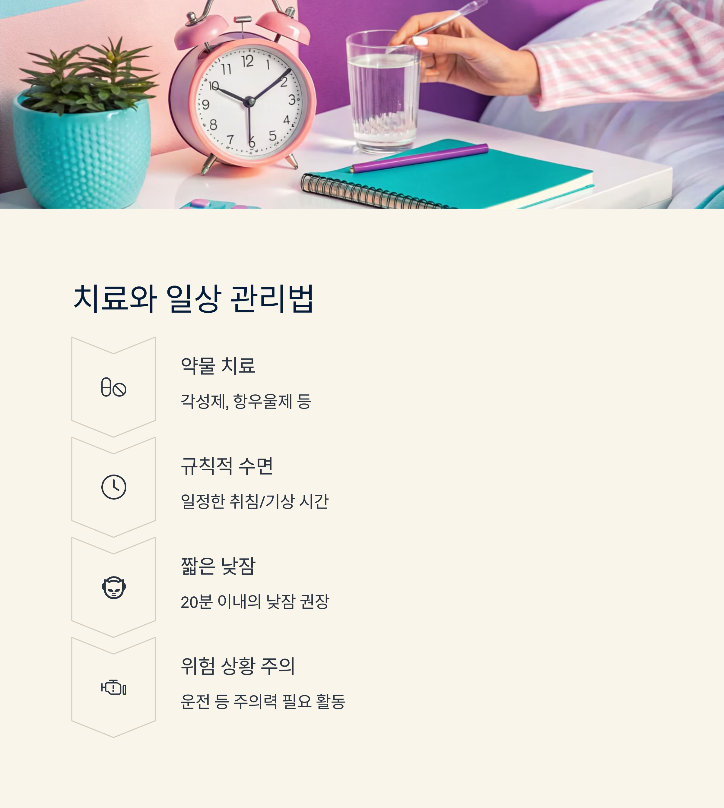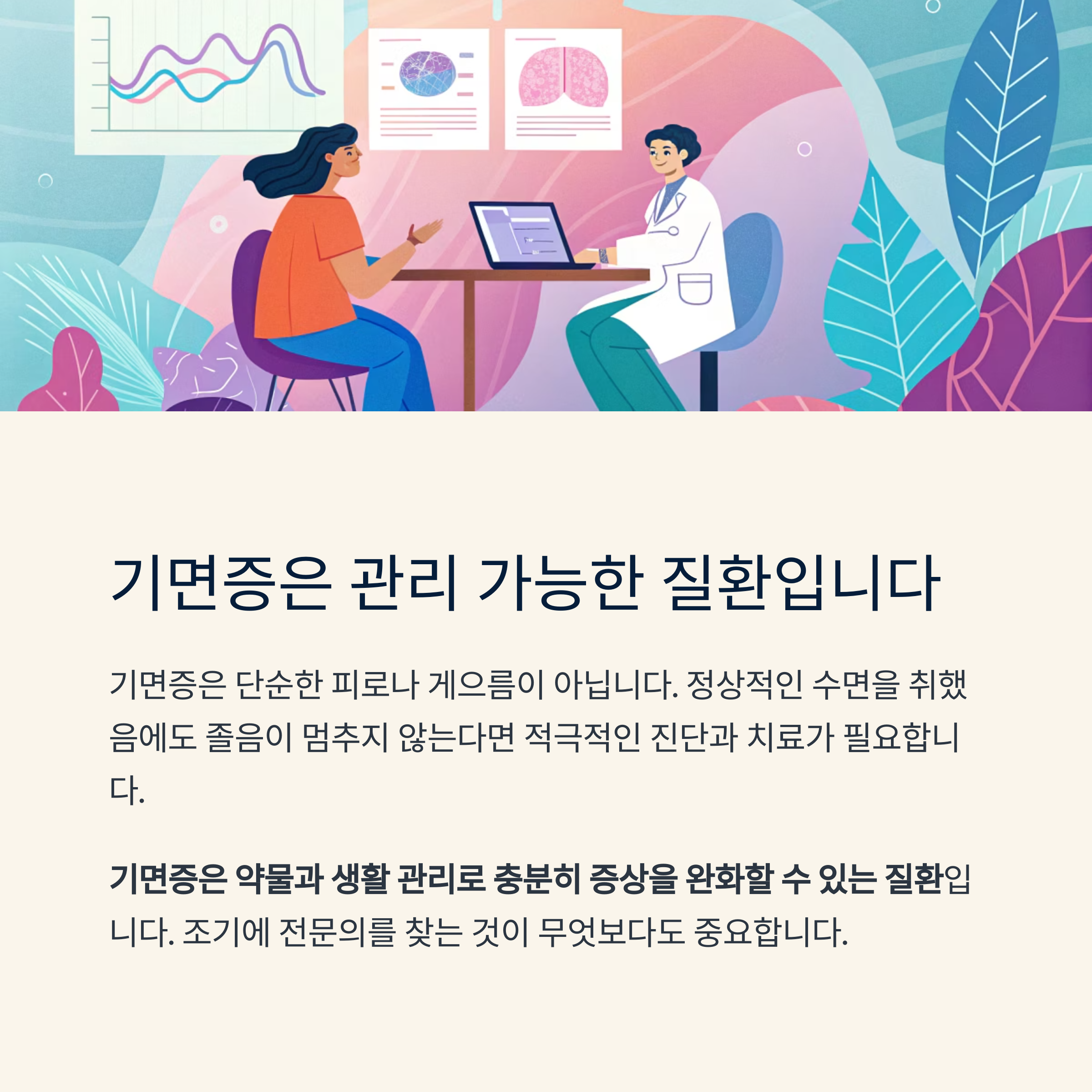 기면증은 약물과 생활 관리로 충분히 증상을 완화할 수 있는 질환입니다.