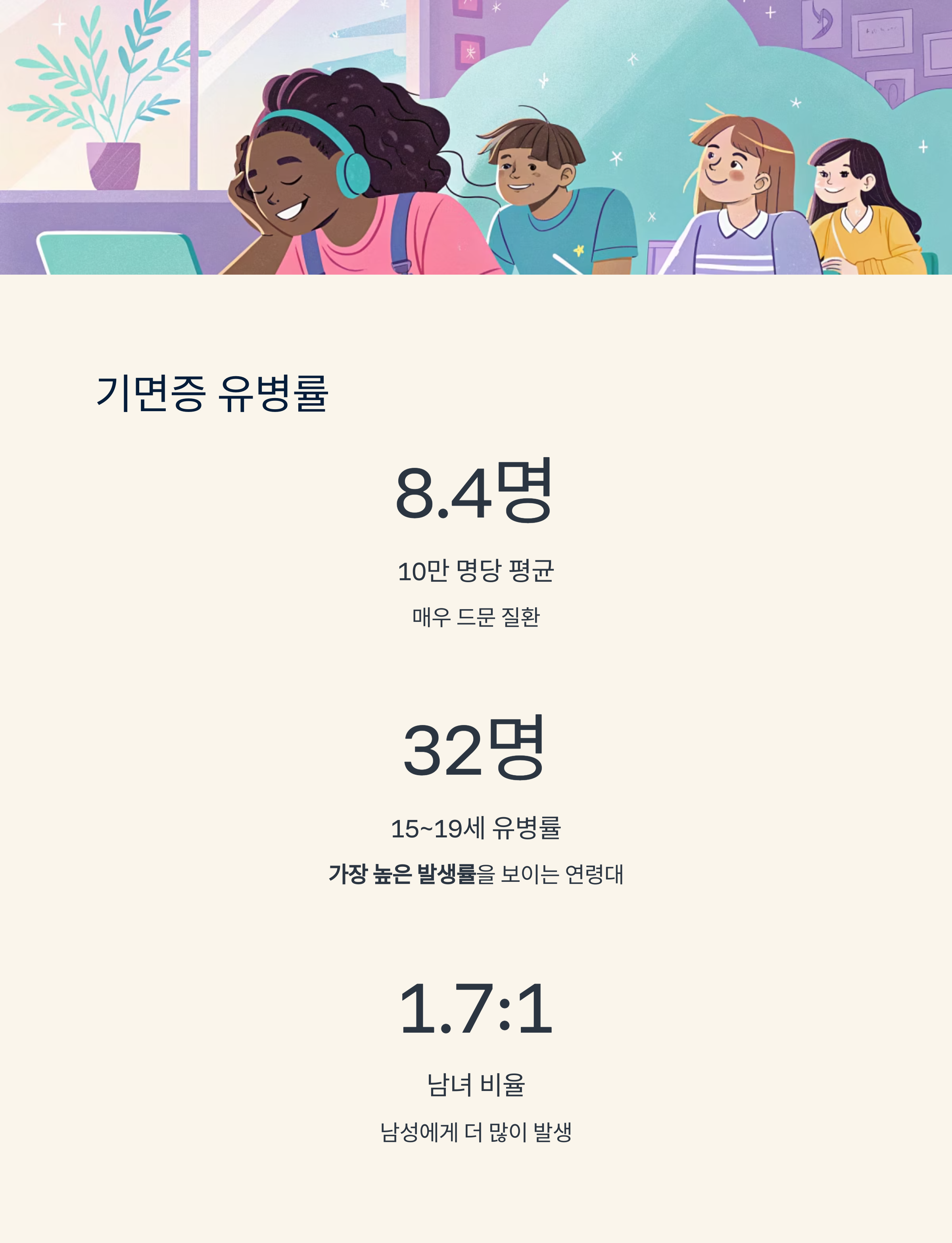 기면증은 드문 질환이지만 특정 연령대에서 발생률이 높습니다.