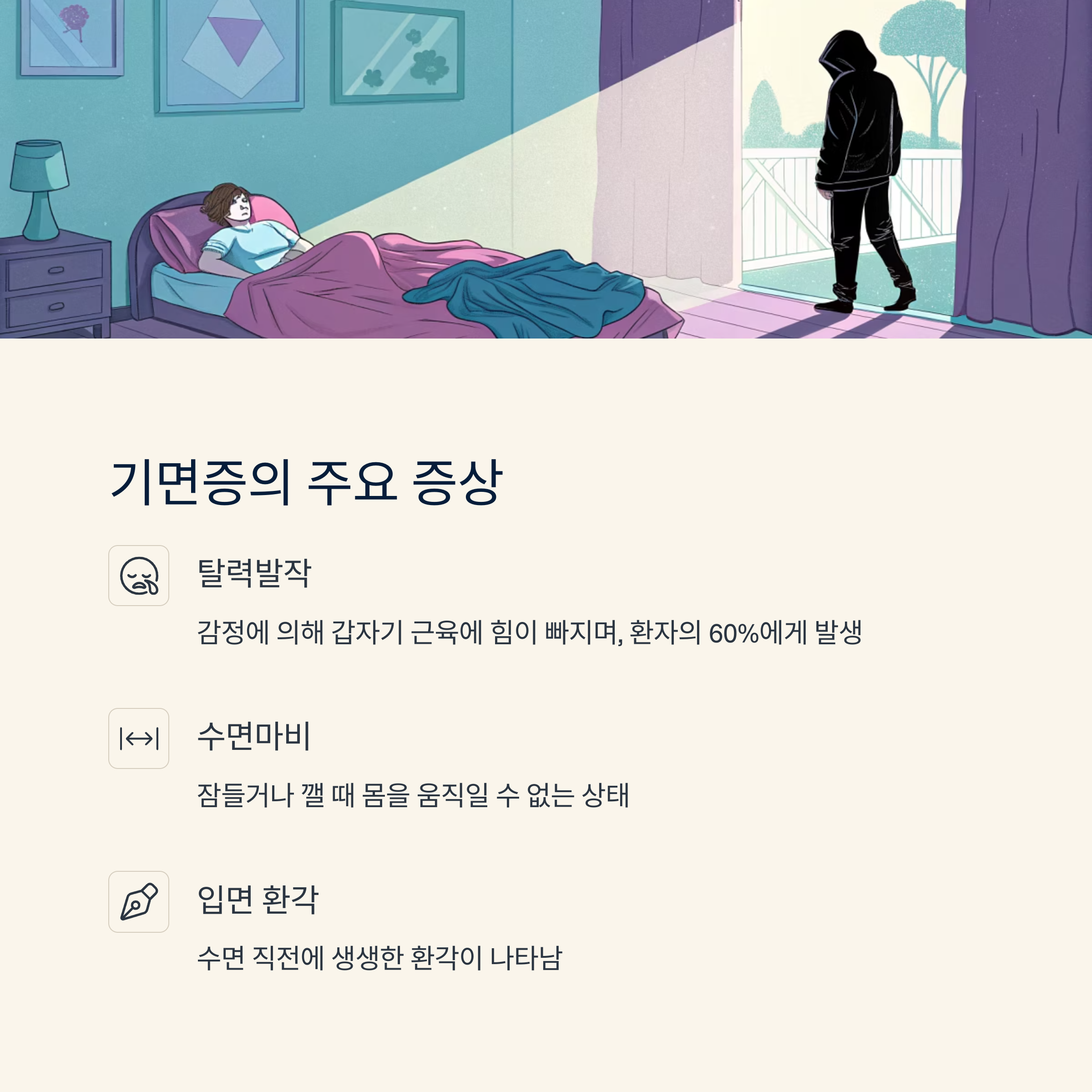 | 탈력발작 | 웃음·놀람 등의 감정에 의해 갑자기 근육에 힘이 빠짐 | 의식은 유지되며 60% 환자에게 발생 |