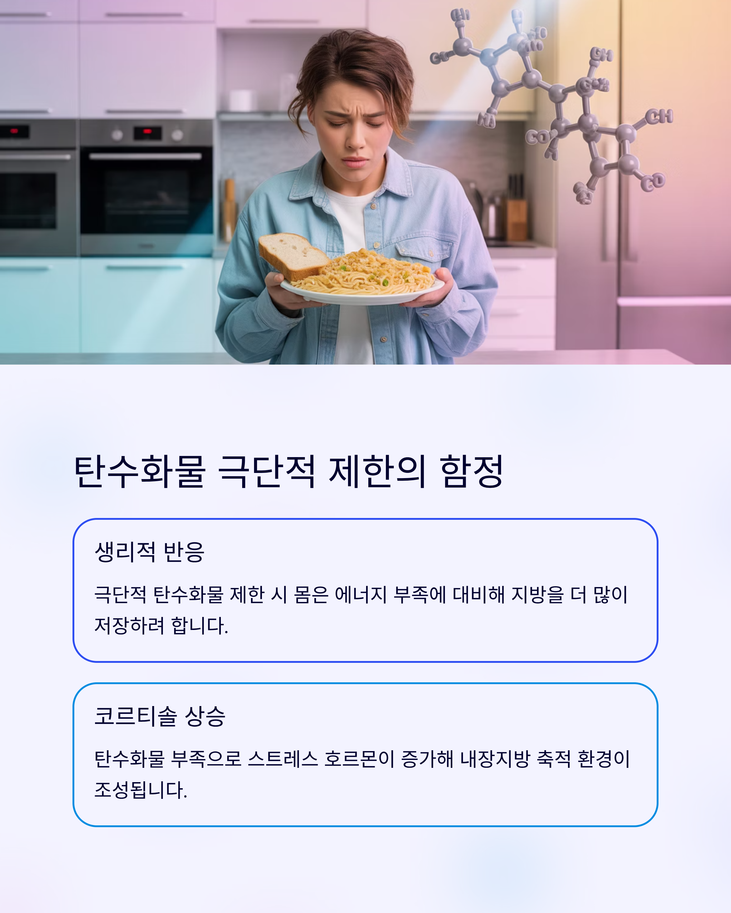다이어트를 시작하면서 가장 먼저 줄이는 게 탄수화물이죠. 하지만 극단적으로 탄수화물을 제한하면, 우리 몸은 에너지 부족 상태에 대비해 지방을 더 많이 저장하려는 생리적 반응을 보입니다. 특히 내장지방은 스트레스나 부족한 영양소에 반응해 쉽게 증가할 수 있어요.