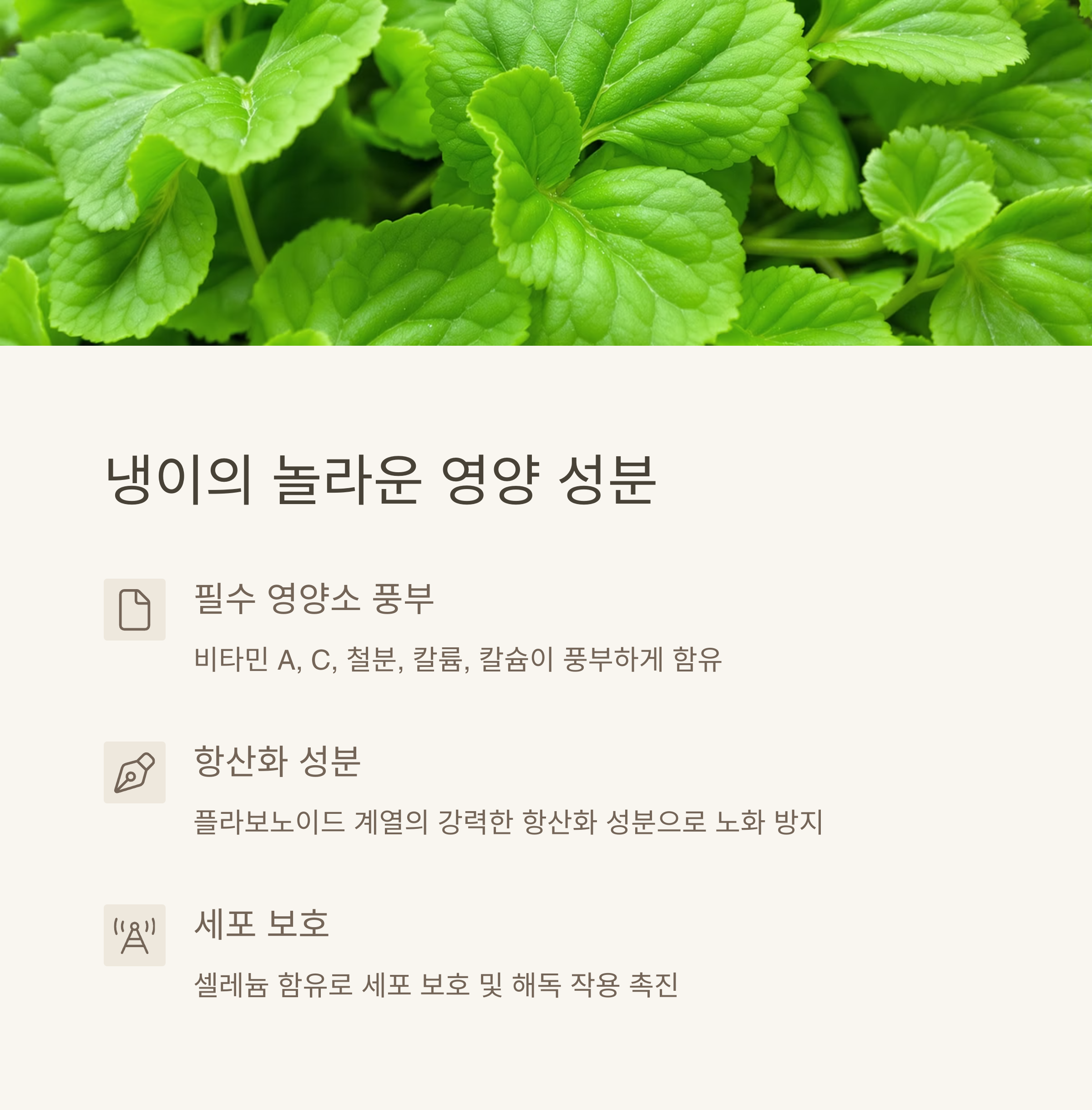 | 냉이의 주요 영양소 | 비타민 A, C, 칼슘 및 풍부한 단백질과 플라보노이드 함유 |