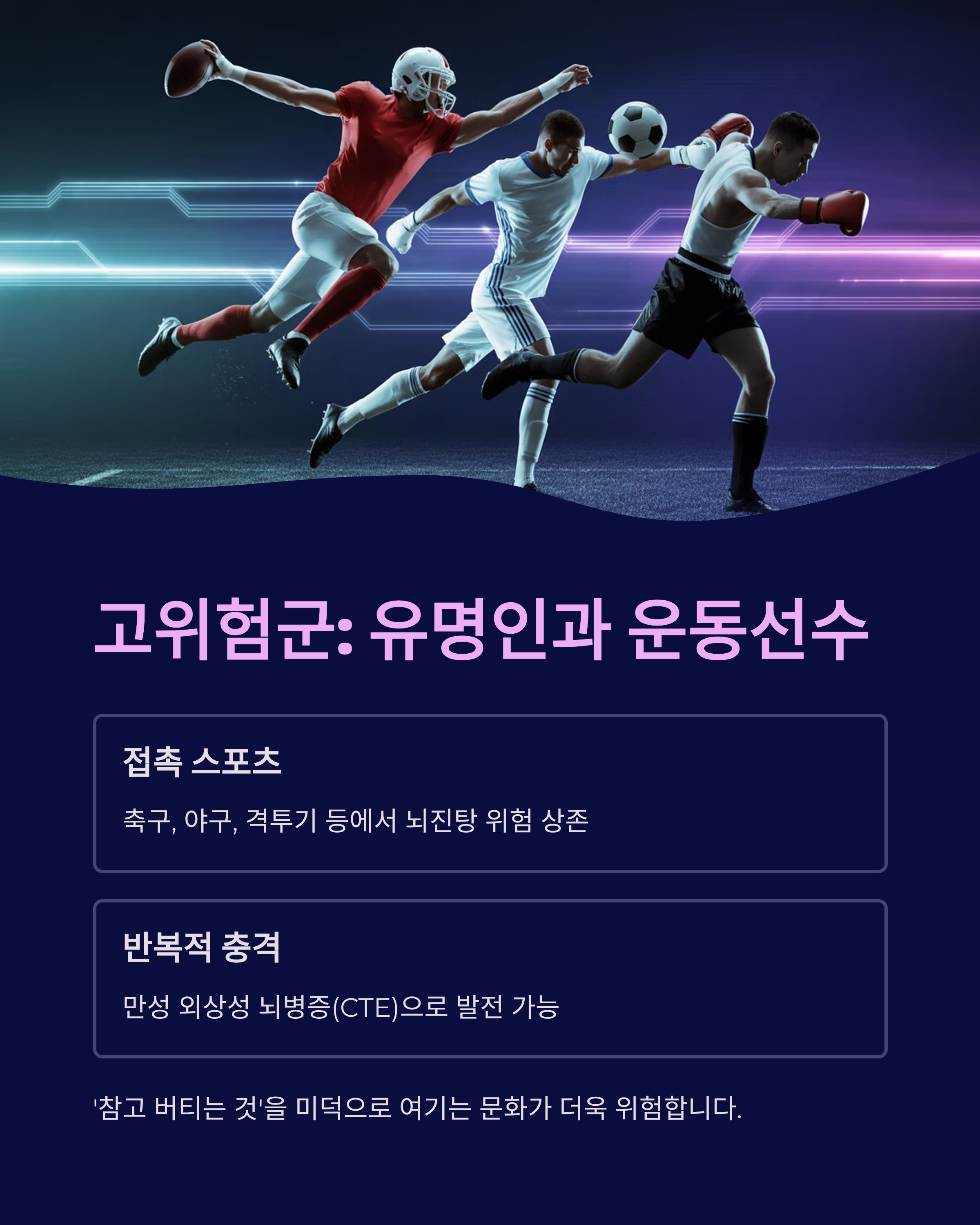 접촉 스포츠가 많은 축구, 야구, 격투기 등에서는 뇌진탕 위험이 항상 존재합니다. 특히 반복적인 충격은 만성 외상성 뇌병증(CTE)으로 이어질 수 있기에 더욱 위험합니다. 문제는, 유명인이나 선수들이 '참고 버티는 것'을 미덕처럼 여긴다는 점입니다.