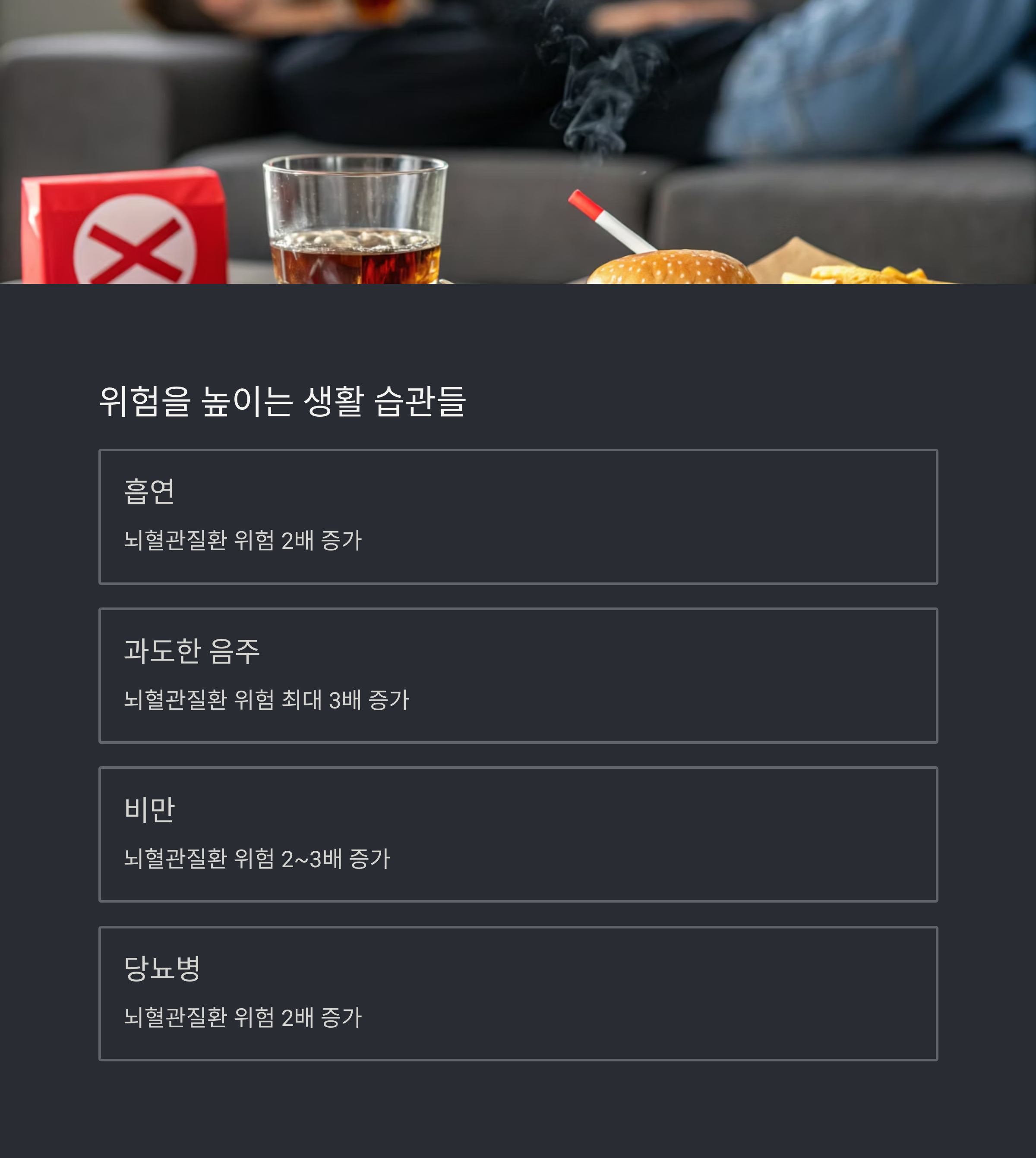 고혈압 외에도 흡연, 음주, 비만, 당뇨, 고지혈증 등도 뇌혈관질환의 위험을 높이는