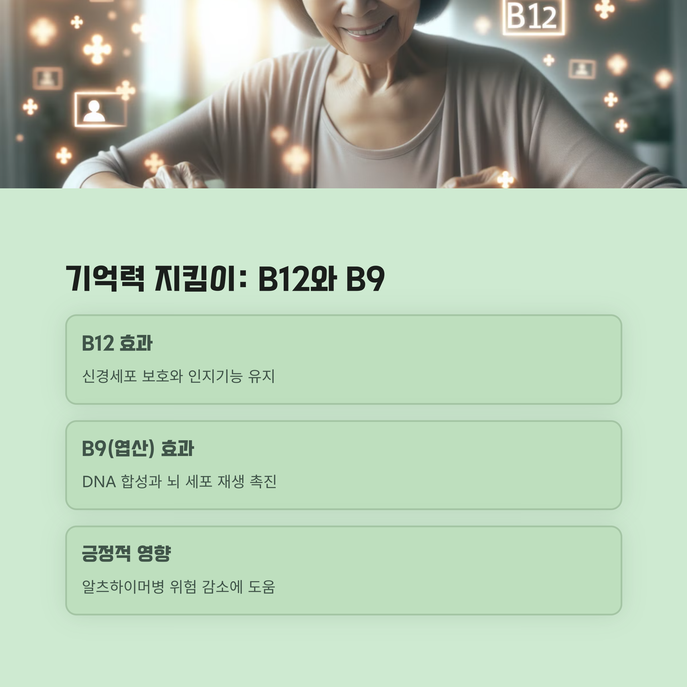 B12와 B9가 특히 뇌 건강과 관련 깊어요. 인지 기능과 기억력을 유지하는 데 핵심적인 역할을 하거든요.