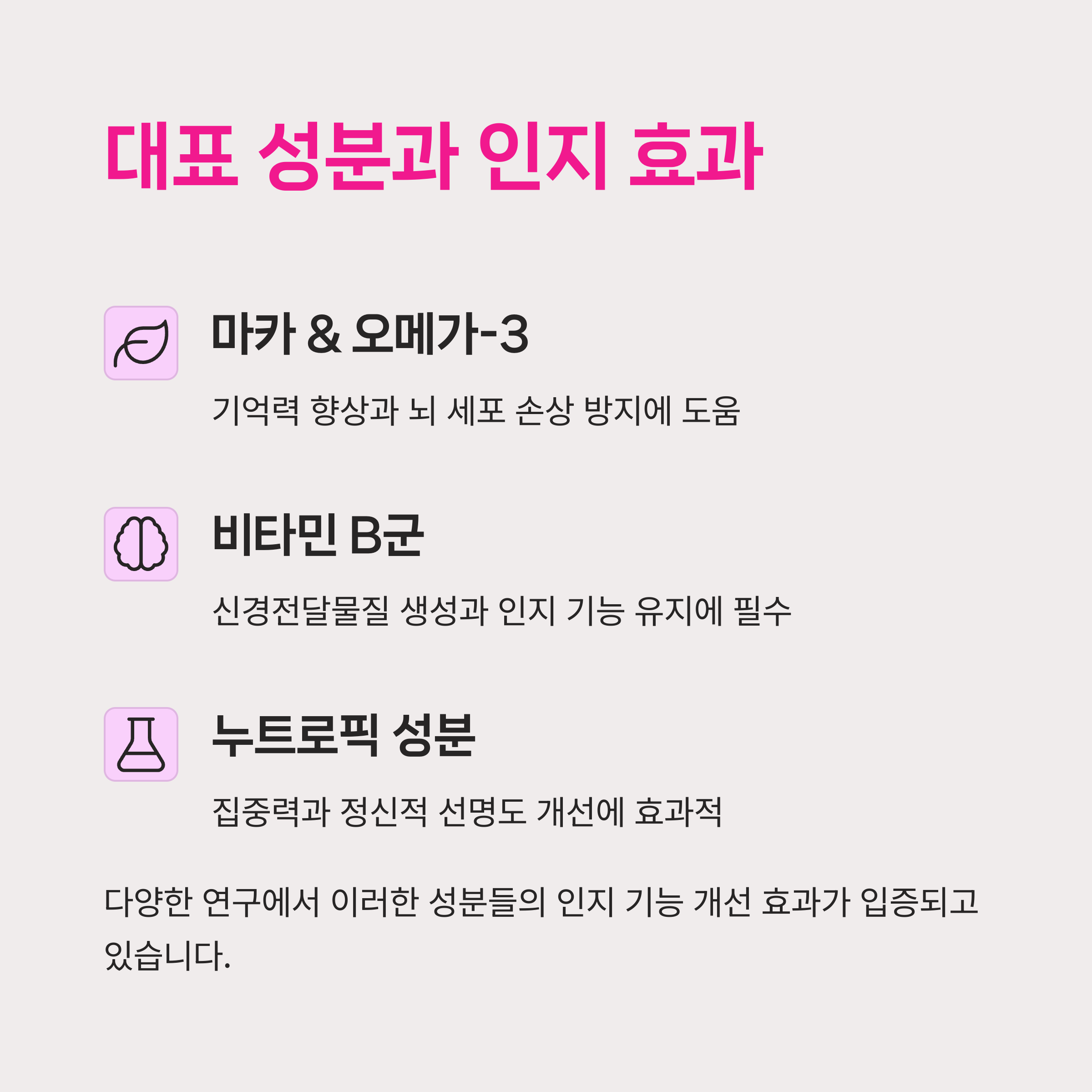 | 임상 연구로 피로 감소 및 학습능력 향상 확인 | 장기 복용 시 인지기능 보호에 도움 | 신경계 보완, 불안 감소와 정신 집중에 효과 |
