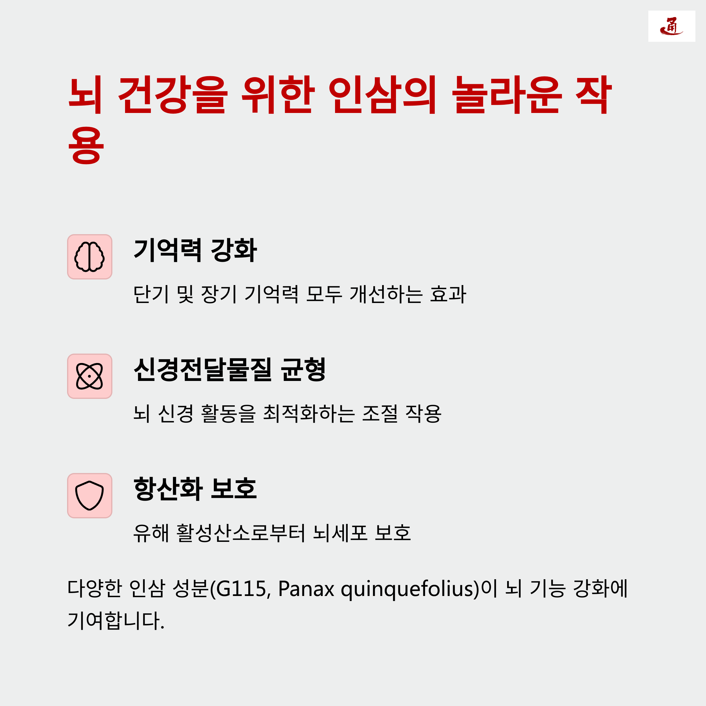 인삼은 단기 및 장기 기억력 개선, 알츠하이머 예방, 신경전달물질 조절, 항산화 작용 등 다방면에서 뇌 건강에 긍정적인 영향을 주는 자연 치료제로 자리 잡고 있습니다. 특히 장기 복용 시 효과가 더욱 분명히 나타나며, 복합 요법과 함께 활용할 경우 뇌 기능 향상 효과를 극대화할 수 있습니다. 물론, 개인의 체질이나 유전자 유형에 따라 반응은 다를 수 있으므로 주의 깊은 섭취가 필요하며, 의료 전문가와의 상담을 권장드립니다. 지금 바로 일상에 인삼을 더해 뇌 건강을 지키는 현명한 선택을 해보시기 바랍니다.