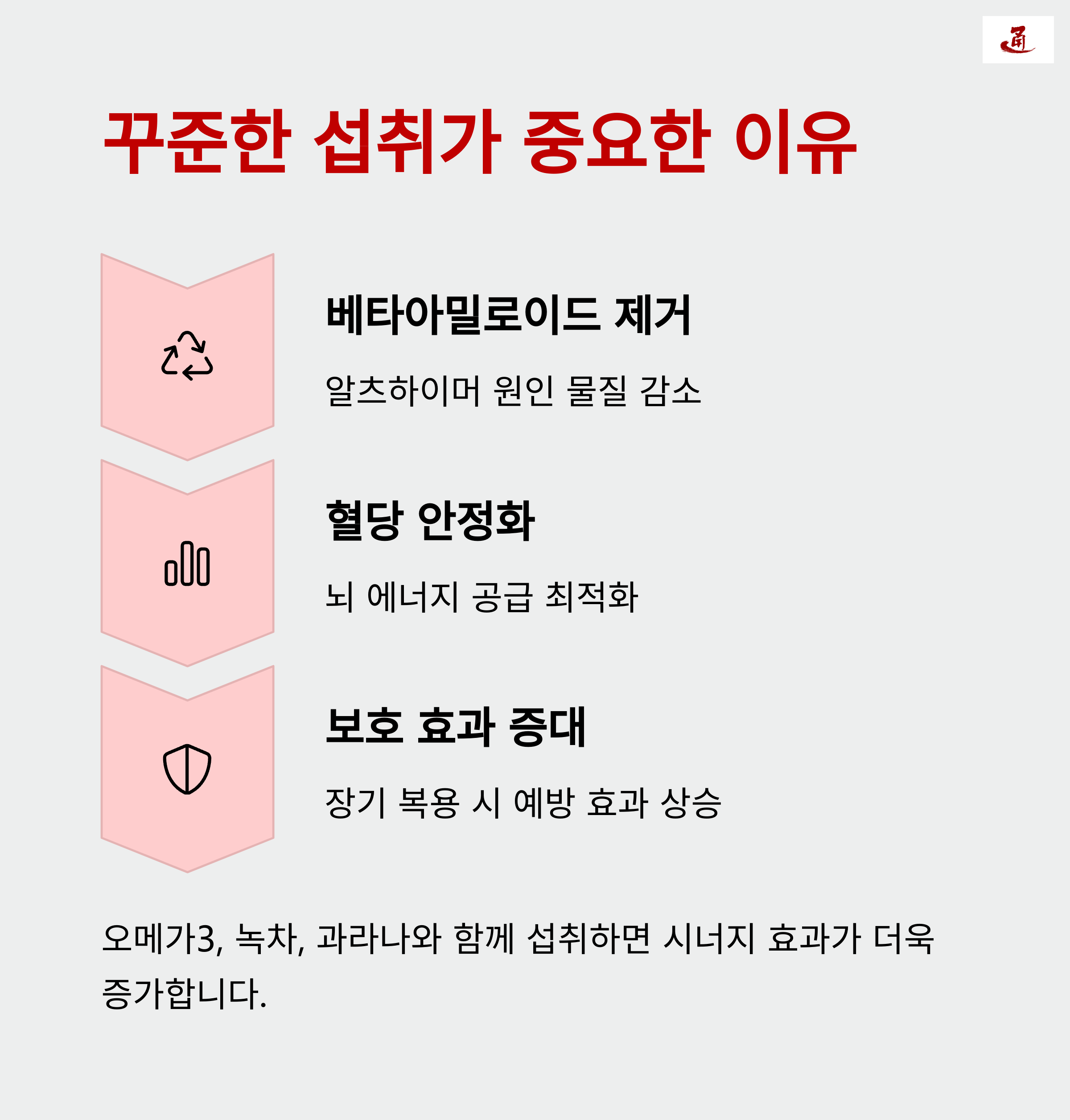 | 단기/장기 기억력 모두에 임상적 개선 확인 | APOE4 음성군에서 지연 기억력 개선 효과 | 오메가3 및 녹차와 병용 시 시너지 효과 기대 |