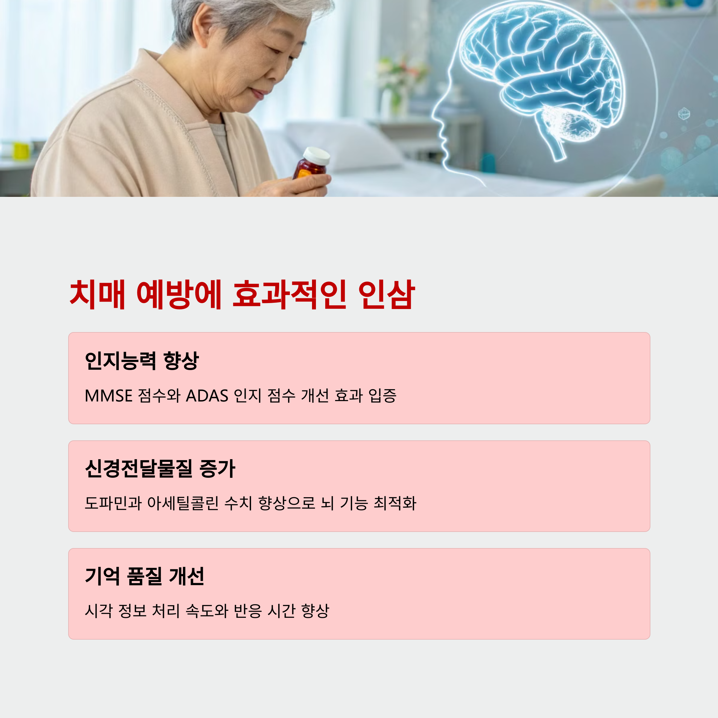 인삼은 알츠하이머 환자에게도 긍정적인 작용을 보여주고 있습니다. 12주간의 인삼 분말 복용으로 MMSE 점수가 3.2점 상승하고 ADAS 인지 점수가 4.7점 개선되었으며, 베타아밀로이드 플라크는 동물 실험에서 28.6% 감소하는 등 뇌세포 보호 효과를 나타냈습니다. 또한, 신경전달물질 조절 능력이 탁월하여 도파민 18%, 노르에피네프린 15% 증가와 아세틸콜린 전환효소 활성 22% 증가가 확인되었습니다. 이로 인해 정보처리 속도와 기억력 강화에 도움이 되는 것으로 분석됩니다.