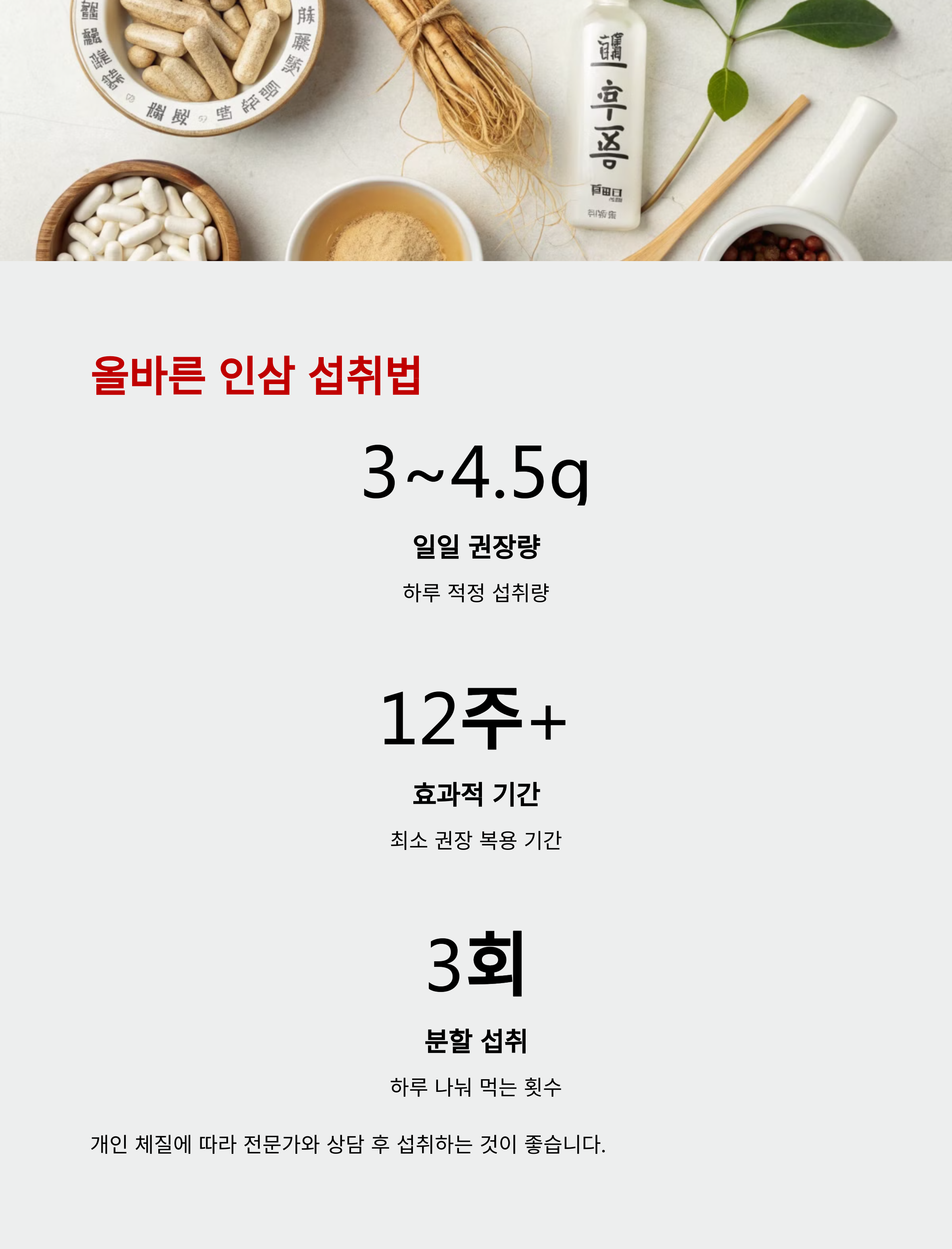 인삼은 단기 및 장기 기억력 개선, 알츠하이머 예방, 신경전달물질 조절, 항산화 작용 등 다방면에서 뇌 건강에 긍정적인 영향을 주는 자연 치료제로 자리 잡고 있습니다. 특히 장기 복용 시 효과가 더욱 분명히 나타나며, 복합 요법과 함께 활용할 경우 뇌 기능 향상 효과를 극대화할 수 있습니다. 물론, 개인의 체질이나 유전자 유형에 따라 반응은 다를 수 있으므로 주의 깊은 섭취가 필요하며, 의료 전문가와의 상담을 권장드립니다. 지금 바로 일상에 인삼을 더해 뇌 건강을 지키는 현명한 선택을 해보시기 바랍니다.