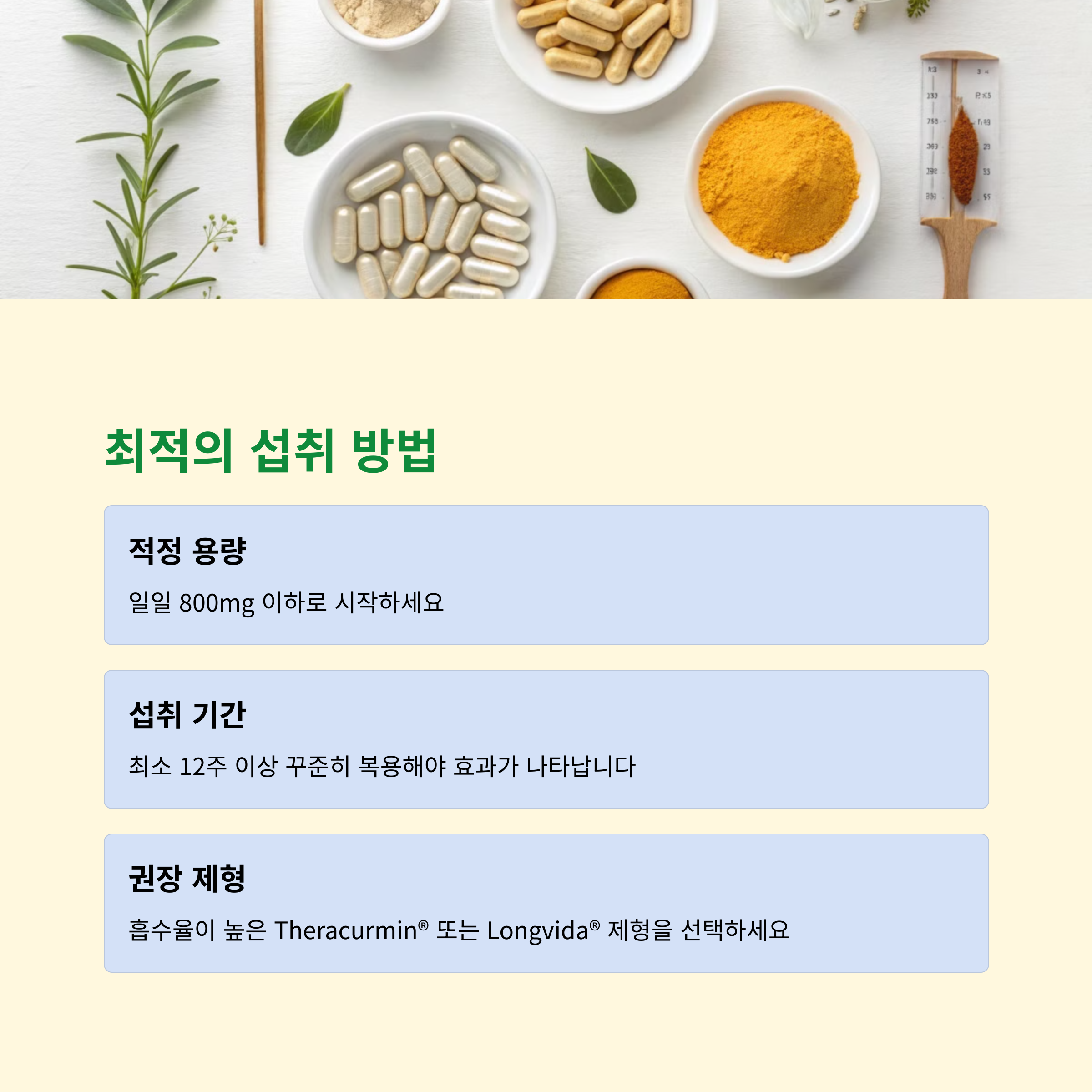효과적인 커큐민 섭취를 위해서는 적절한 용량과 기간을 지키는 것이 중요합니다. 연구에 따르면, 하루 800mg 전후의 섭취가 가장 효과적이며 최소 12주 이상 꾸준히 복용할 경우 인지 기능 향상 효과를 확인할 수 있습니다. Theracurmin®이나 Longvida®와 같이 생체이용률을 높인 제형은 체내 흡수를 더욱 원활하게 해주며, 일반 커큐민보다 더 뛰어난 효능을 기대할 수 있습니다. 다만 일부 사람들에게는 위장 장애나 복통 등의 경미한 부작용이 발생할 수 있으므로, 개인의 체질을 고려해 섭취량을 조절하는 것이 좋습니다.