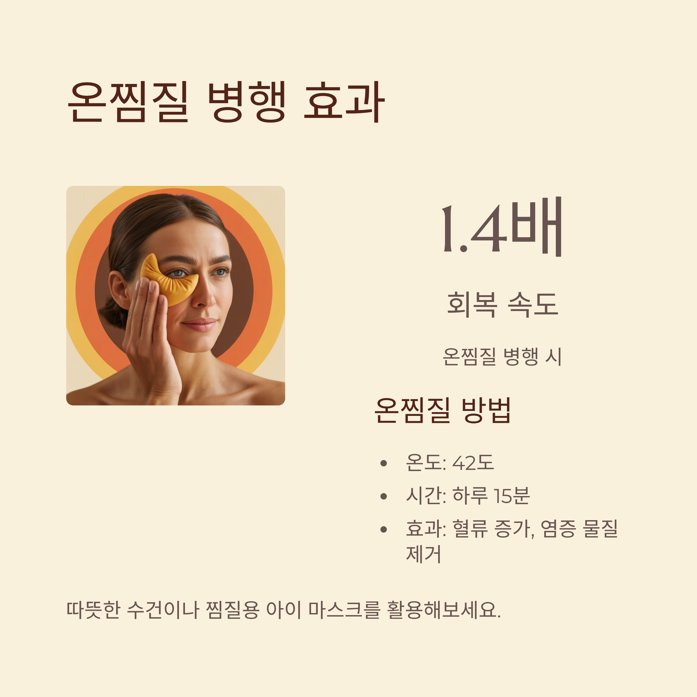 42도 정도의 온찜질을 하루 15분 정도 병행하면 회복 속도가 무려 1.4배나 빨라진다는 연구 결과도 있어요.