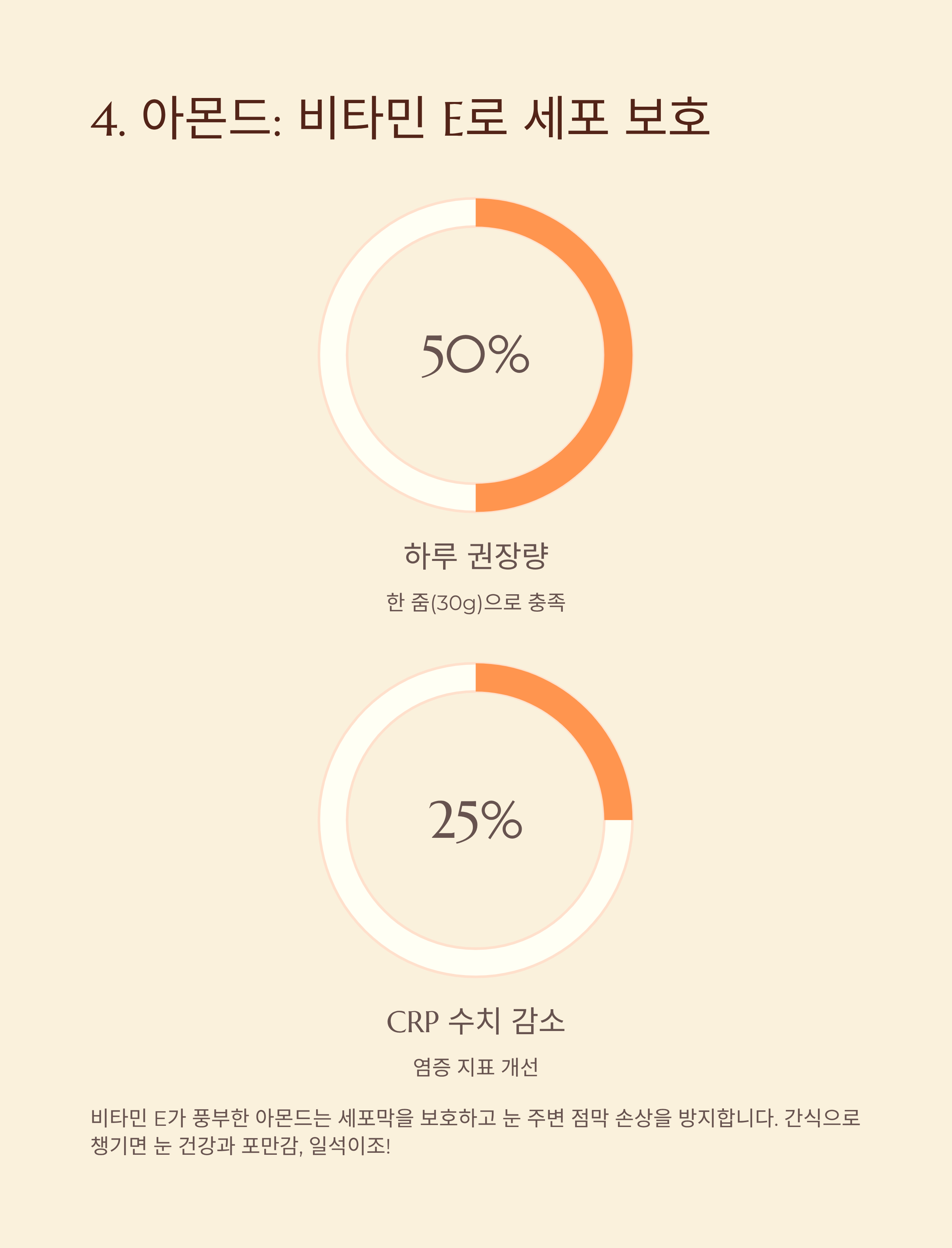 | 4 | 아몬드 | 비타민 E | 7.3mg | 항염, 세포 보호 |