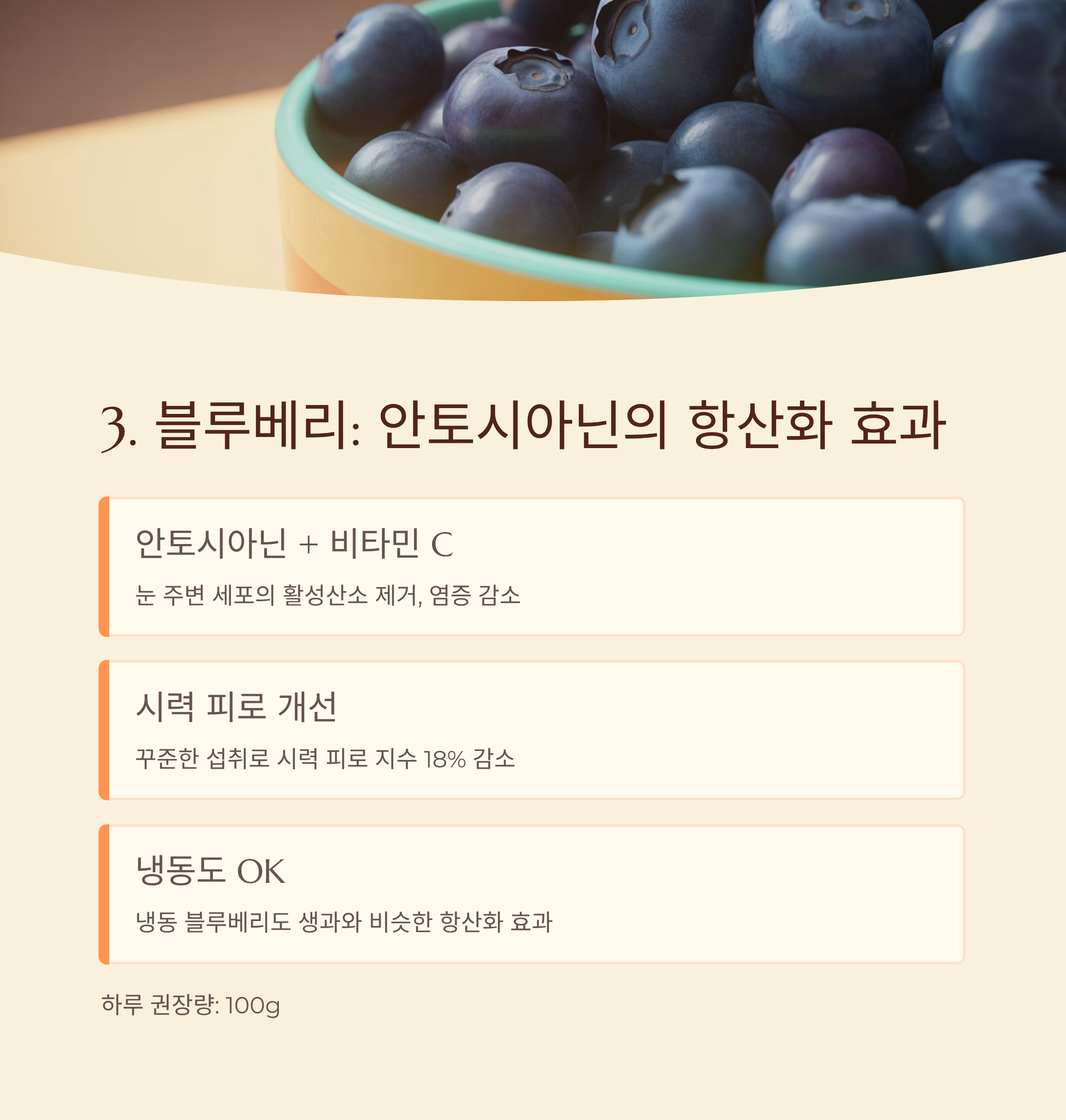 3 블루베리 안토시아닌, 비타민 C 150~300mg 항산화, 염증 완화