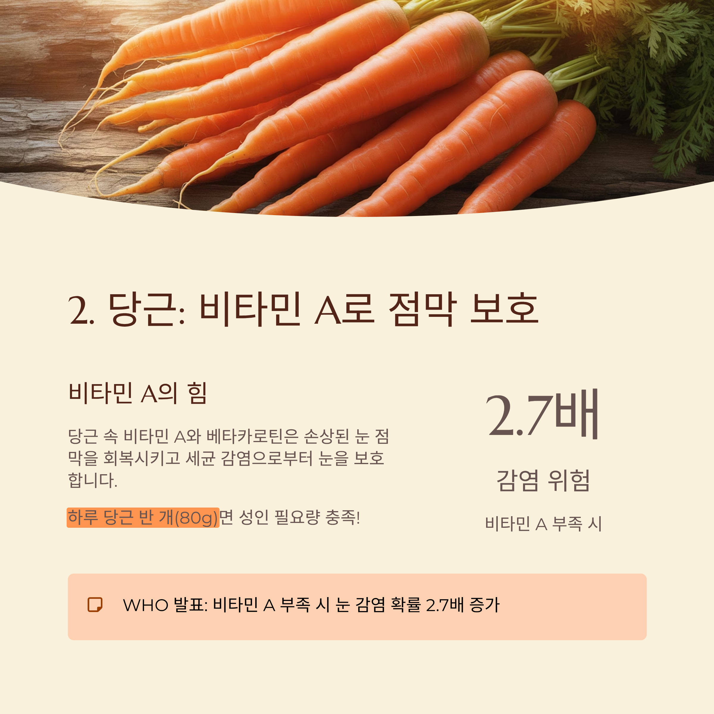 | 2 | 당근 | 비타민 A, 베타카로틴 | 835μg RAE | 점막 보호, 감염 예방 |
