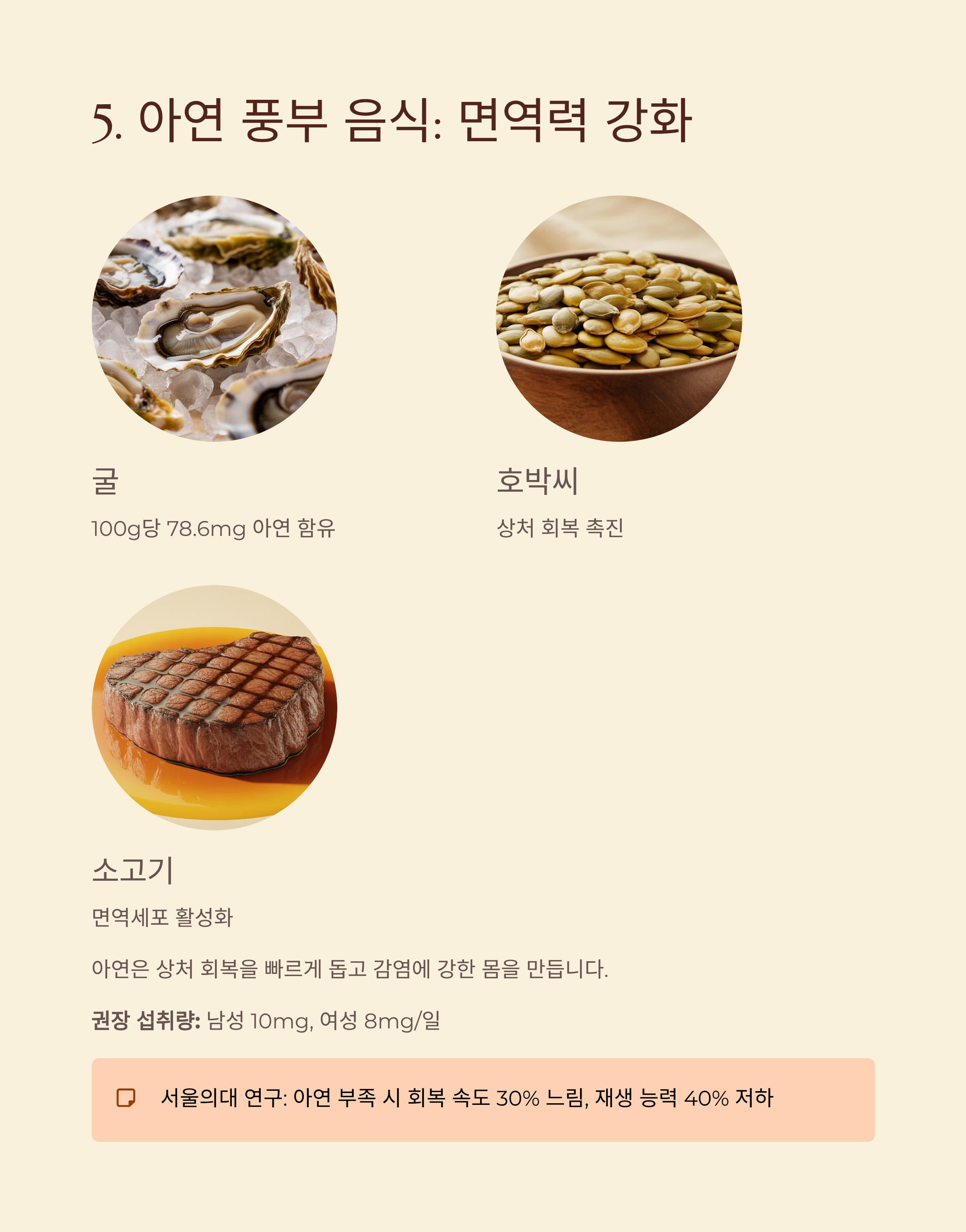 | 5 | 굴·호박씨·소고기 | 아연 | 4.8~78mg | 면역력 향상, 재생 촉진 |