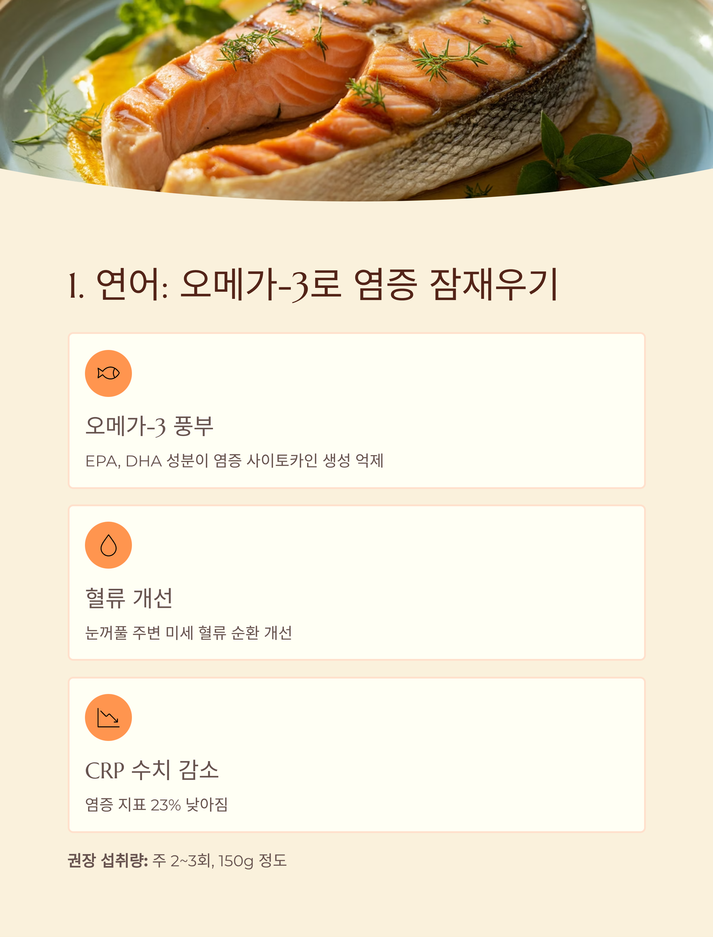연구에 따르면, 오메가-3를 꾸준히 섭취한 그룹에서는 염증 지표인 CRP 수치가 23%나 낮아졌다고 하니, 식단에 꼭 포함해야겠죠?