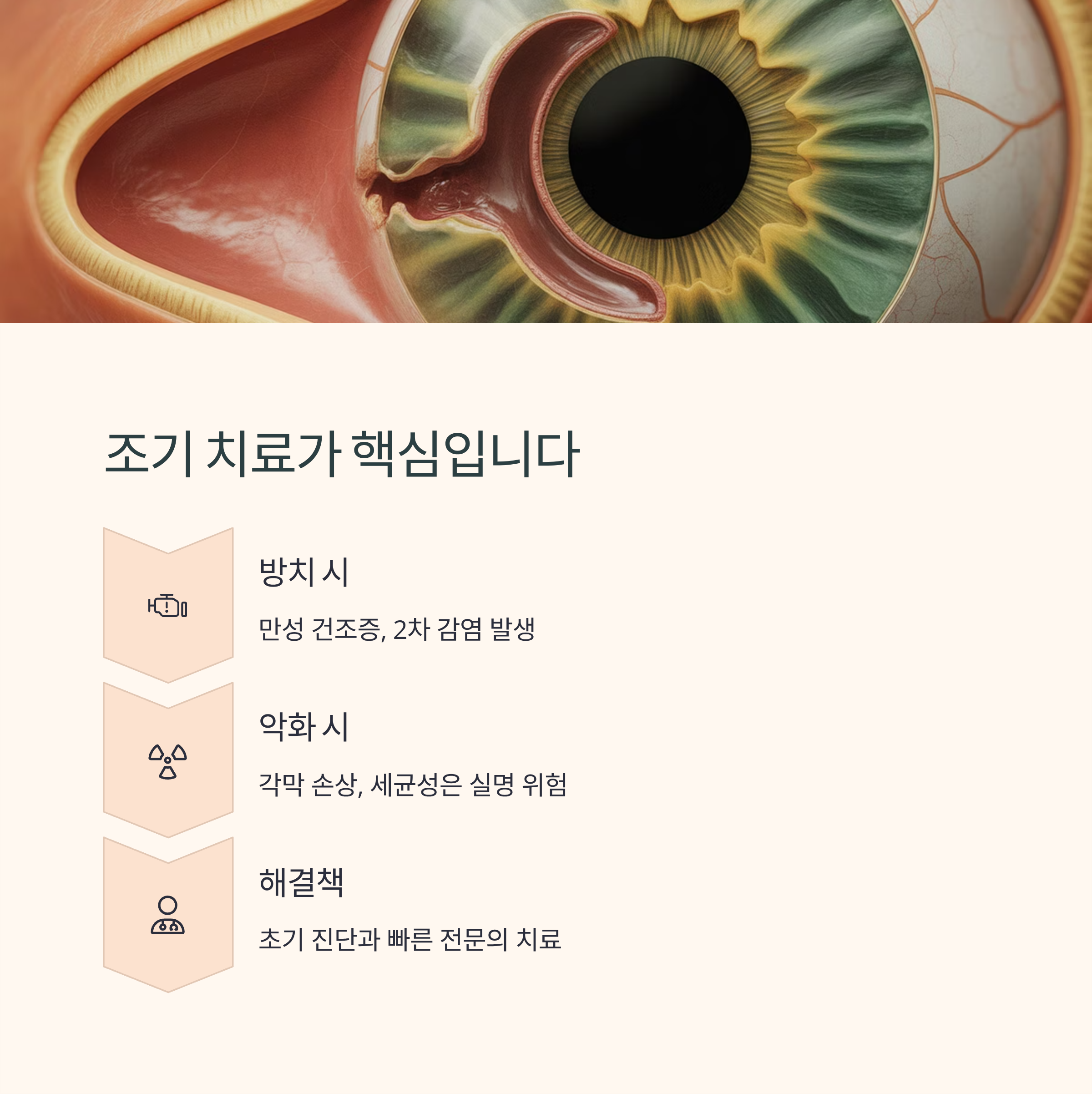 | 합병증 | 각막 천공, 시력 저하 위험 | 만성화 가능성 있으나 심각성 낮음 |