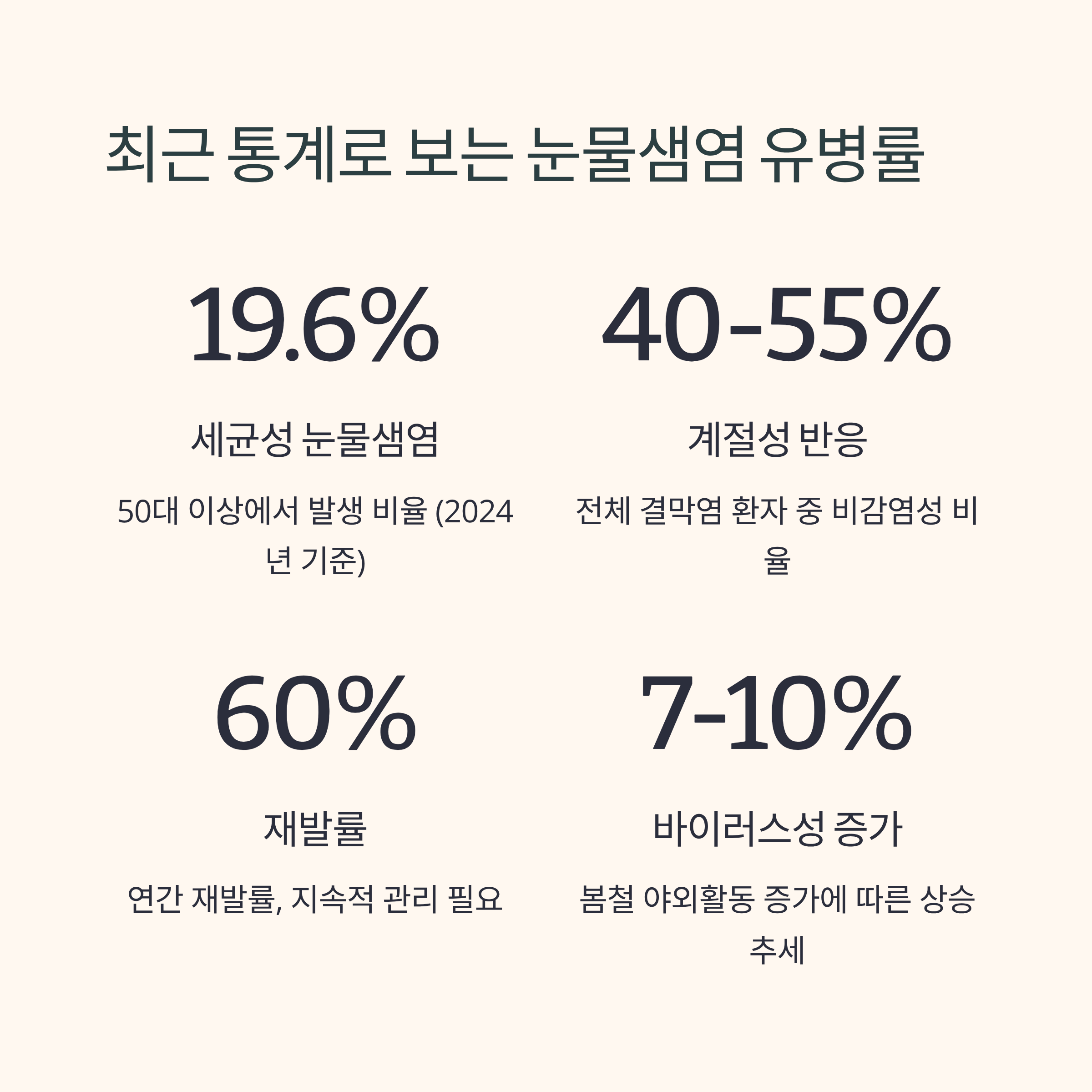 2024년 기준, 세균성 눈물샘염은 주로 50대 이상에게서 19.6% 비율로 나타났습니다. 반면, 비감염성 눈물샘염은 전체 결막염 환자 중 약 40~55%가 계절성 반응에 따른 것으로 보고되었으며, 재발률은 연간 60% 이상에 달합니다. 특히 봄철 야외활동이 늘어남에 따라 바이러스성 질환 비율도 7~10% 증가하고 있는 추세입니다.