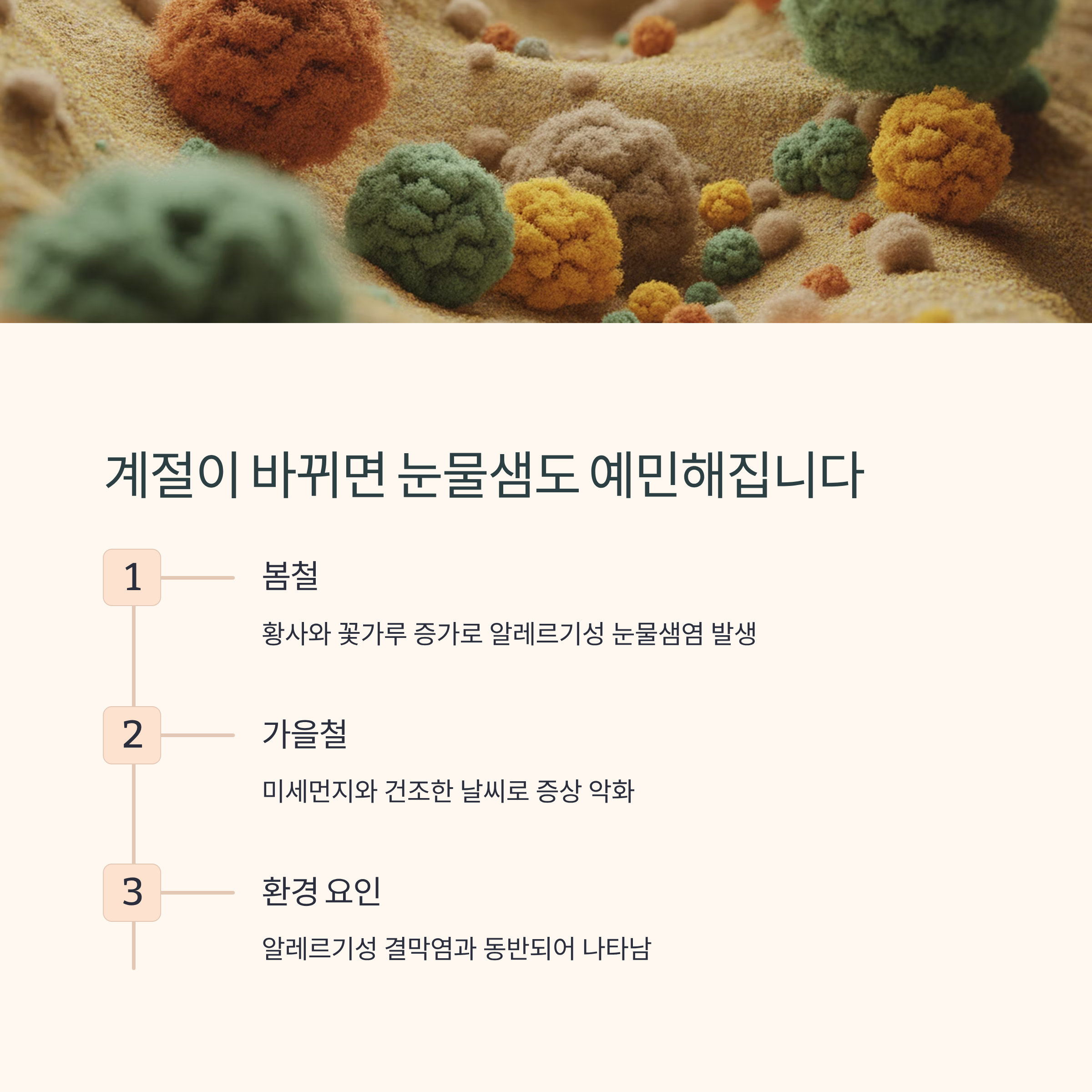 봄과 가을은 황사, 꽃가루 등 미세 입자들이 증가하는 계절입니다. 이러한 환경 요인은 비감염성 눈물샘염을 유발하거나 악화시키며, 특히 알레르기성 결막염과 동반되어 나타나는 경우가 많습니다. 환경 변화에 민감한 분들은 이 시기에 증상이 심해지는 경향이 강합니다.