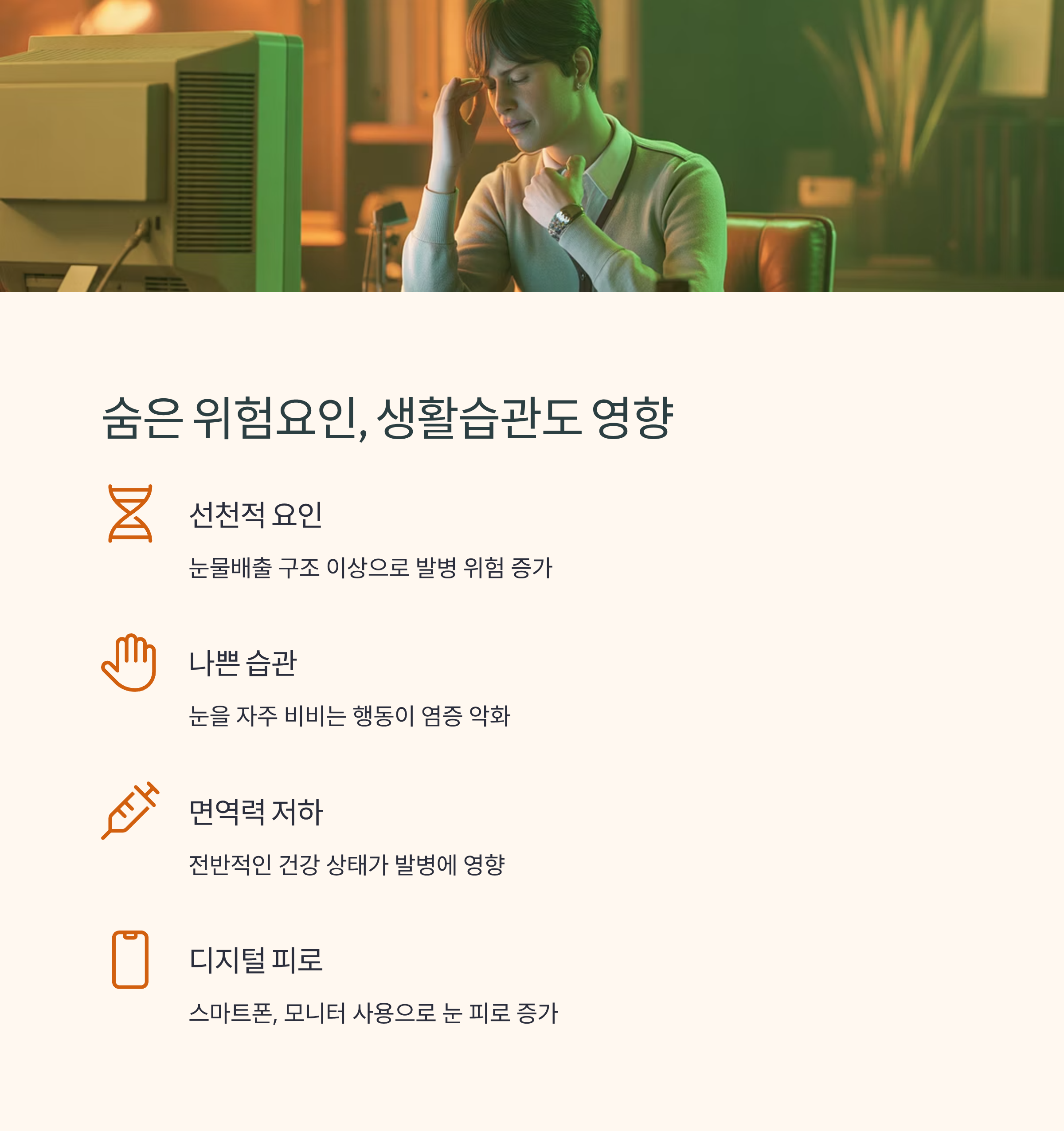 눈물샘염은 단순히 외부 요인만으로 발생하지 않습니다. 선천적인 눈물배출 구조 이상, 눈을 자주 비비는 습관, 면역력 저하 등이 함께 작용하여 발병 위험을 높입니다. 특히 스마트폰, 모니터 사용으로 인한 눈의 피로도 누선염을 악화시킬 수 있으므로 주의가 필요합니다.