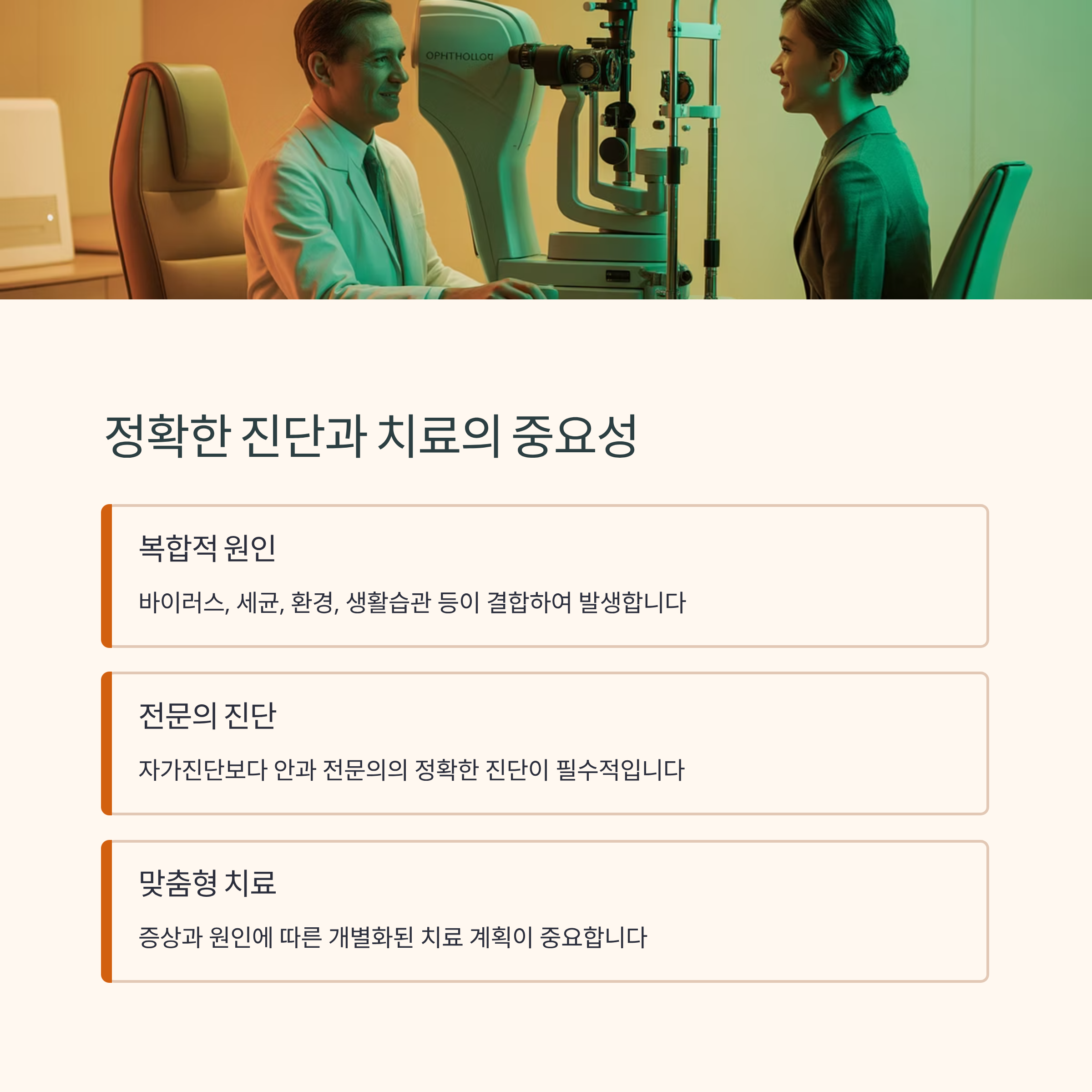 눈물샘염은 그 원인이 단일하지 않으며, 바이러스, 세균, 환경, 생활습관 등 다양한 요인이 결합해 발생합니다. 따라서 자가진단보다는 안과 전문의의 정확한 진단이 중요하며, 증상에 맞는 맞춤형 치료가 필수입니다.