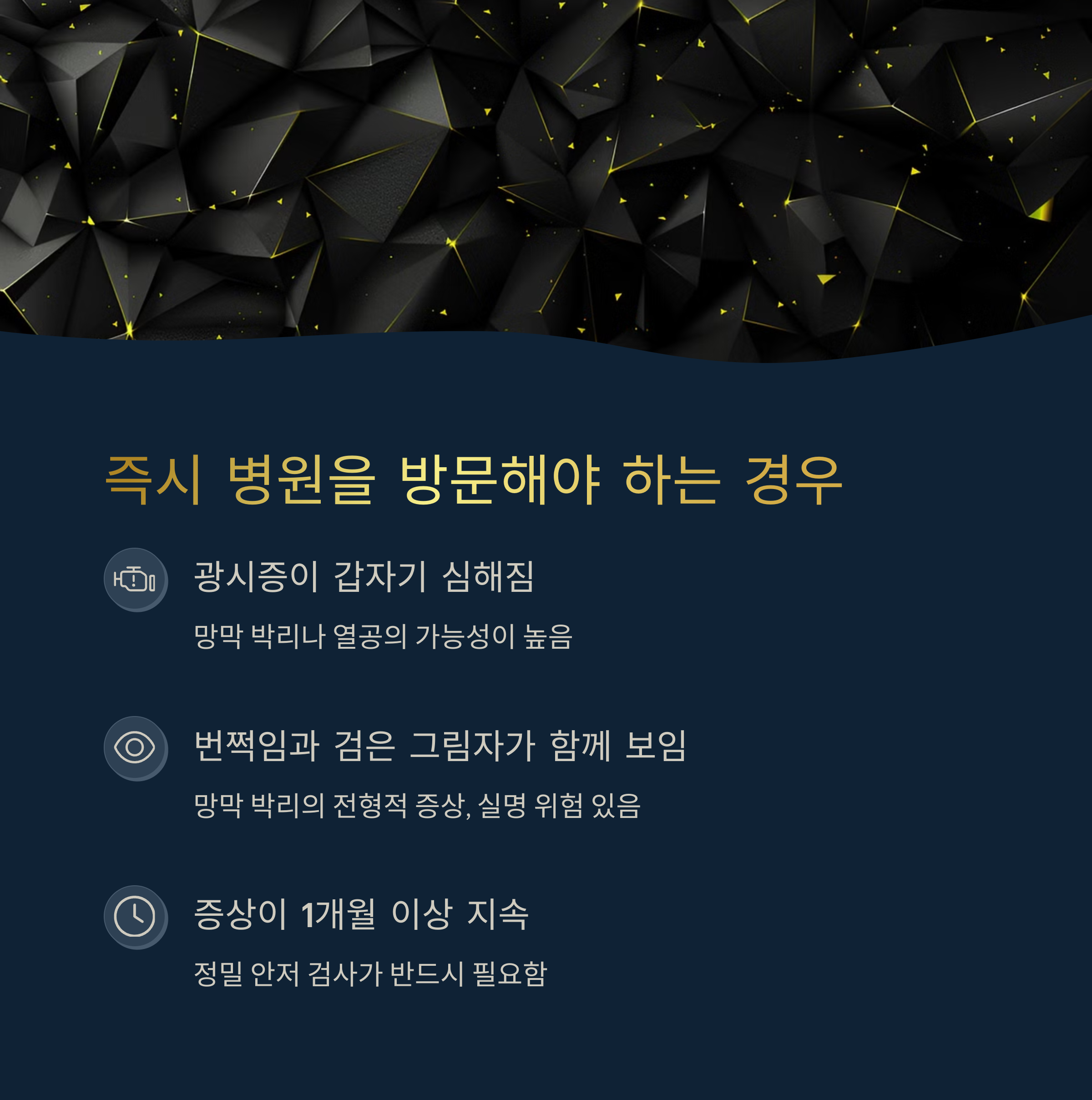 동반된다면 이는 단순 증상을 넘어 망막 질환의 초기 징후일 수 있습니다.