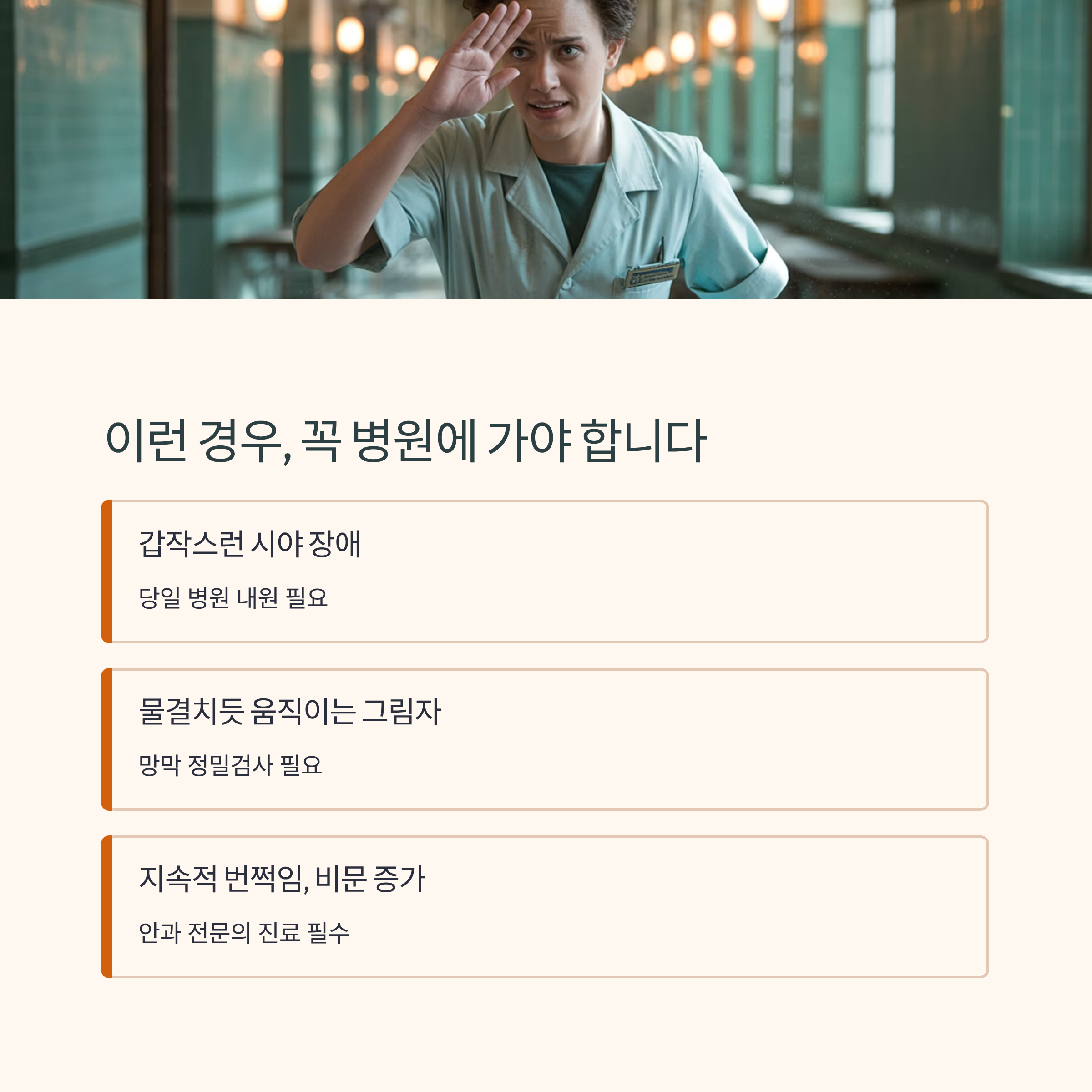 다음과 같은 증상이 함께 나타난다면 즉시 안과 전문의를 찾아야 합니다.