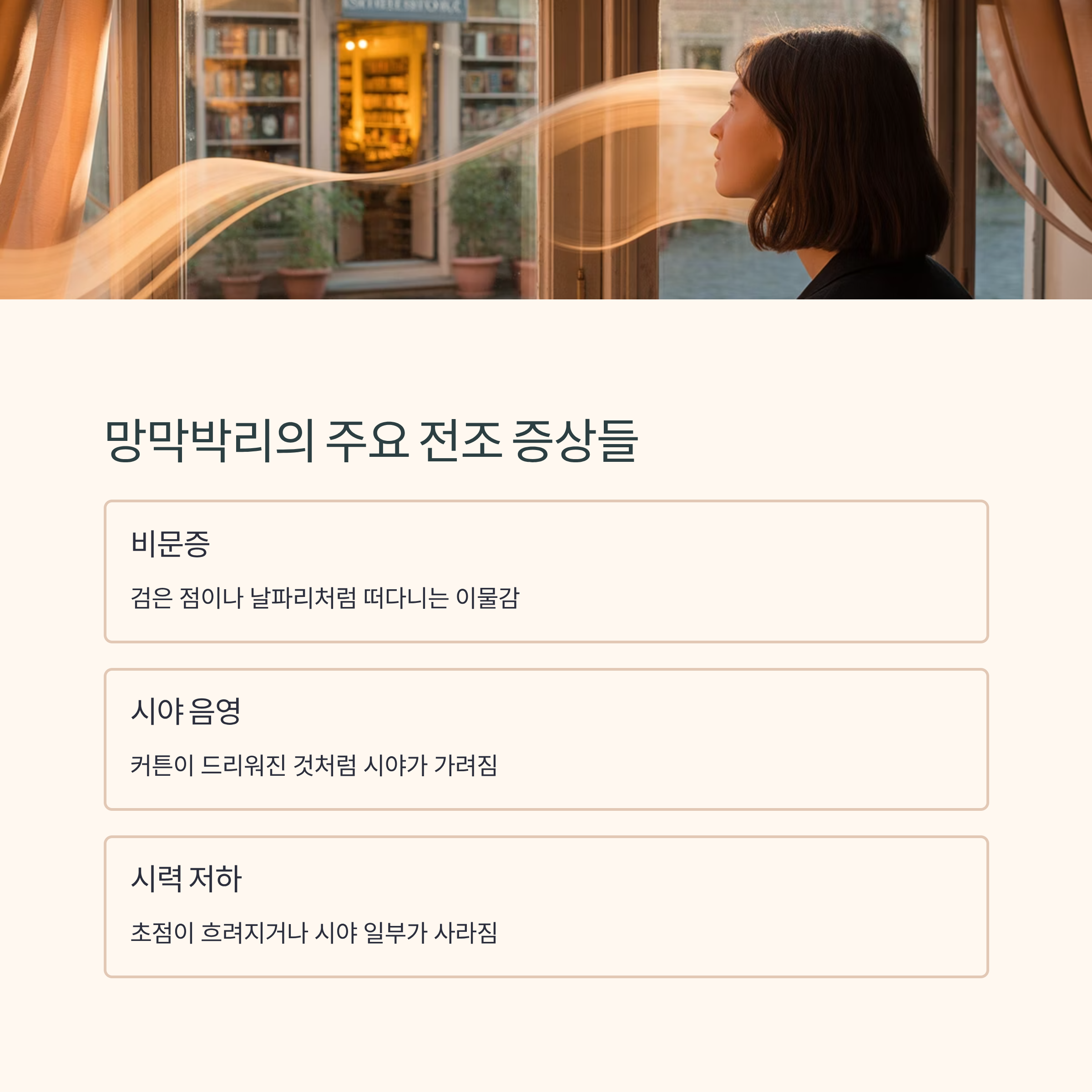 이러한 증상이 자주 반복된다면 단순한 피로나 노안이 아닌, 망막박리의 전조 증상일 가능성이 있습니다.