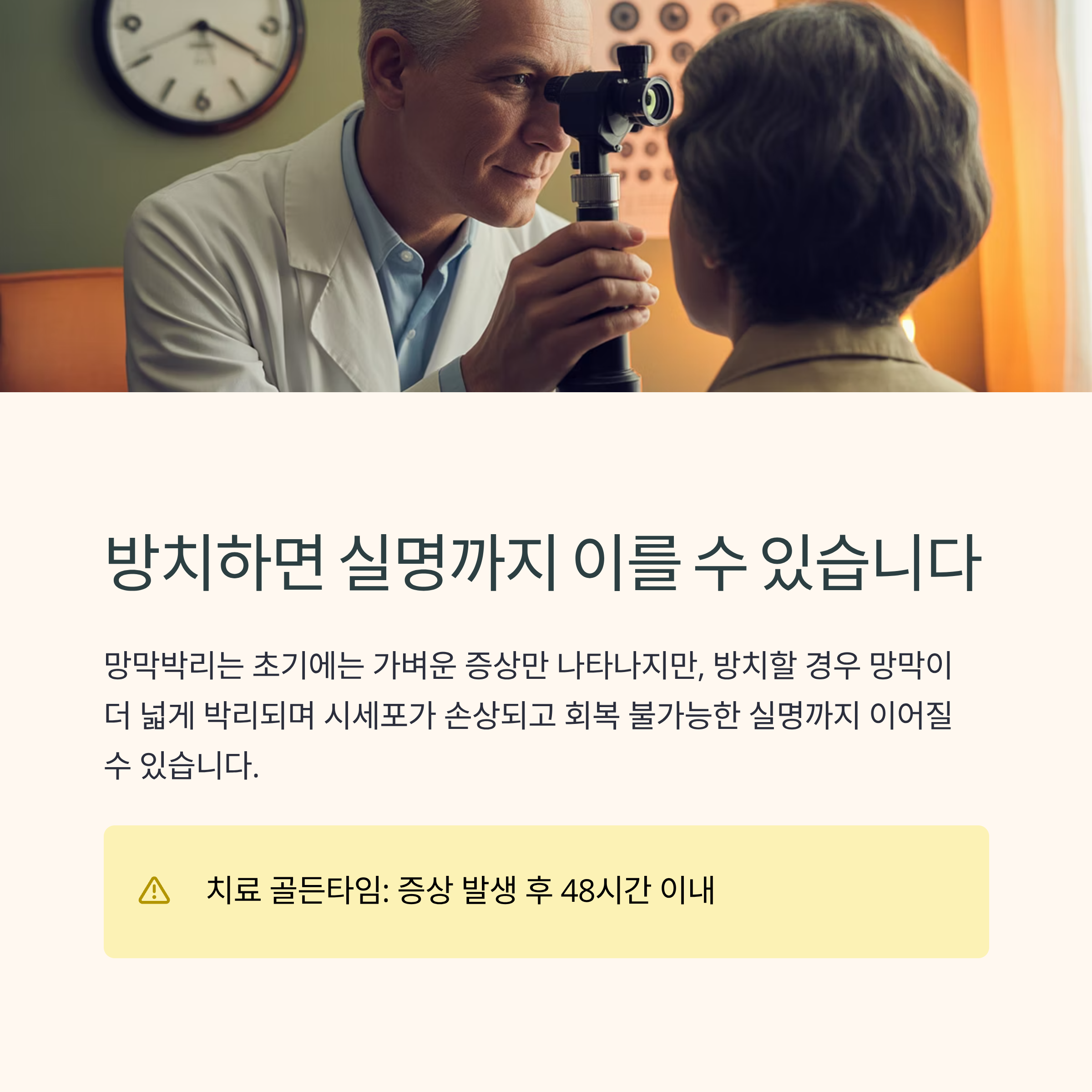 방치할 경우 망막이 더 넓게 박리되며 시세포가 손상되고,